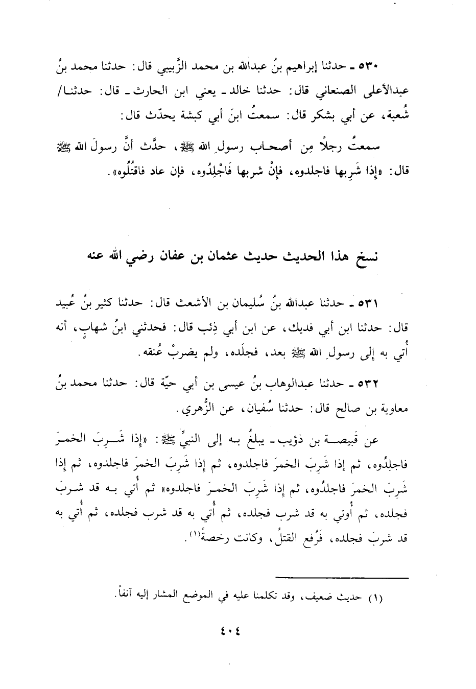 532 - حَدَّثَنَا عَبْدُ الْوَهَّابِ بْنُ عِيسَى بْنِ أَبِي حَيَّةَ، قَالَ: حَدَّثَنَا مُحَمَّدُ بْنُ مُعَاوِيَةَ بْنِ صَالِحٍ، قَالَ: حَدَّثَنَا سُفْيَانُ، عَنِ الزُّهْرِيِّ، عَنْ قَبِيصَةَ بْنِ ذُؤَيْبٍ، يَبْلُغُ بِهِ النَّبِيَّ صَلَّى اللهُ عَلَيْهِ وَسَلَّمَ: «§إِذَا شَرِبَ الْخَمْرَ فَاجْلِدُوهُ، ثُمَّ إِذَا شَرِبَ الْخَمْرَ فَاجْلِدُوهُ، ثُمَّ إِذَا شَرِبَ الْخَمْرَ فَاقْتُلُوهُ، فَأُتِيَ النَّبِيُّ صَلَّى اللهُ عَلَيْهِ وَسَلَّمَ بِرَجُلٍ قَدْ شَرِبَ الْخَمْرَ فَجَلَدَهُ، ثُمَّ أُتِيَ بِهِ قَدْ شَرِبَ فَجَلَدَهُ، ثُمَّ أُتِيَ بِهِ قَدْ شَرِبَ فَجَلَدَهُ، ثُمَّ أُتِيَ بِهِ قَدْ شَرِبَ فَجَلَدَهُ، فَرُفِعَ الْقَتْلُ وَكَانَتْ رُخْصَةً» -[405]- وَحَدَّثَنَا أَحْمَدُ بْنُ مُحَمَّدِ بْنِ عَبْدِ الْكَرِيمِ الْفَزَارِيُّ، قَالَ: حَدَّثَنَا زِيَادُ بْنُ يَحْيَى الْحَسَّانِيُّ، قَالَ: حَدَّثَنَا أَبُو بَحْرٍ الْبَكْرَاوِيُّ، قَالَ: حَدَّثَنَا يَحْيَى بْنُ أَبِي أُنَيْسَةَ، قَالَ: حَدَّثَنَا الزُّهْرِيُّ، عَنْ قَبِيصَةَ بْنِ ذُؤَيْبٍ، قَالَ: قَالَ رَسُولُ اللَّهِ صَلَّى اللهُ عَلَيْهِ وَسَلَّمَ فَذَكَرَ نَحْوَهُ