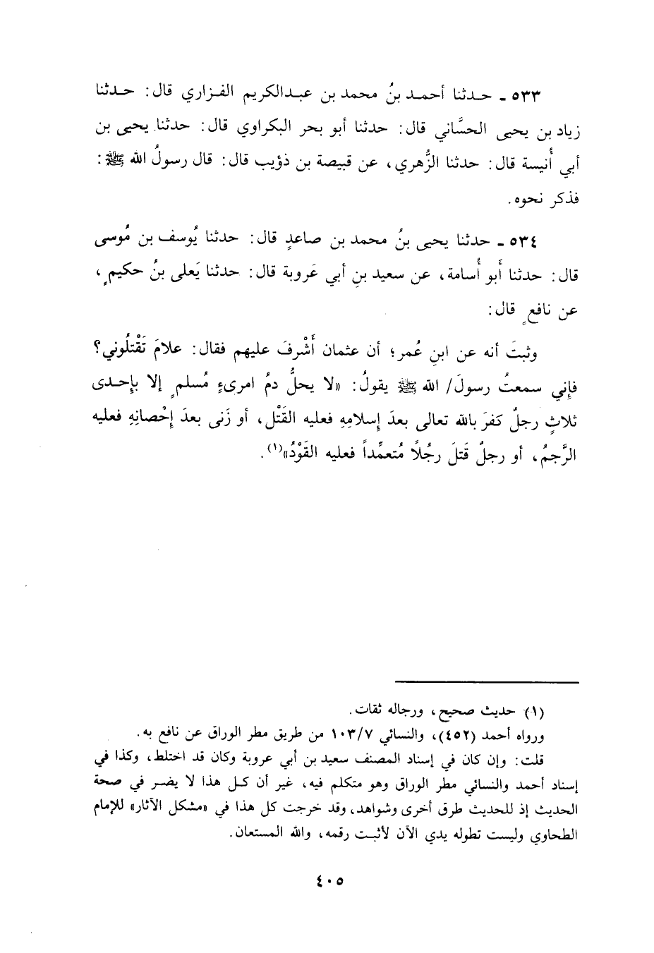 534 - حَدَّثَنَا يَحْيَى بْنُ مُحَمَّدِ بْنِ صَاعِدٍ، قَالَ: حَدَّثَنَا يُوسُفُ بْنُ مُوسَى، قَالَ: حَدَّثَنَا أَبُو أُسَامَةَ، عَنْ سَعِيدِ بْنِ أَبِي عَرُوبَةَ، قَالَ: حَدَّثَنَا يَعْلَى بْنُ حَكِيمٍ، عَنْ نَافِعٍ، قَالَ: رُوِّيتُ عَنِ ابْنِ عُمَرَ،: أَنَّ عُثْمَانَ، أَشْرَفَ عَلَيْهِمْ فَقَالَ: عَلَامَ تَقْتُلُونِي فَإِنِّي سَمِعْتُ رَسُولَ اللَّهِ صَلَّى اللهُ عَلَيْهِ وَسَلَّمَ يَقُولُ: §«لَا يَحِلُّ دَمُ امْرِئٍ مُسْلِمٍ إِلَّا بِإِحْدَى ثَلَاثٍ إِلَّا رَجُلٌ كَفَرَ بِاللَّهِ تَعَالَى بَعْدَ إِسْلَامِهِ فَعَلَيْهِ الْقَتْلُ، أَوْ زَنَا بَعْدَ إِحْصَانِهِ فَعَلَيْهِ الرَّجْمُ، أَوْ رَجُلٌ قَتَلَ رَجُلًا مُتَعَمِّدًا فَعَلَيْهِ الْقَوَدُ»