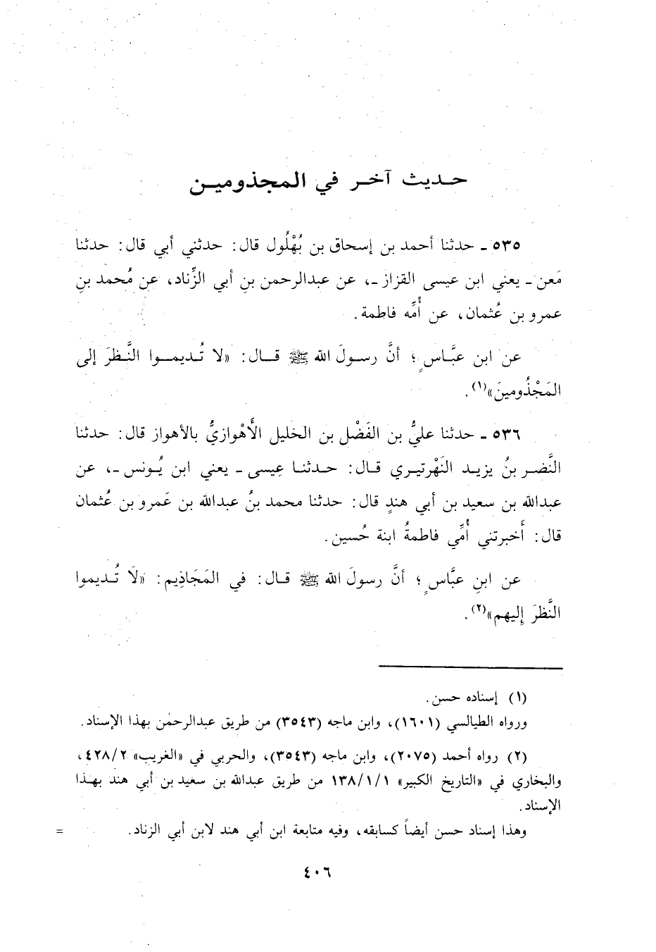 535 - حَدَّثَنَا أَحْمَدُ بْنُ إِسْحَاقَ بْنِ بُهْلُولٍ، قَالَ: حَدَّثَنِي أَبِي، قَالَ: حَدَّثَنَا مَعْنُ بْنُ عِيسَى الْقَزَّازُ، عَنْ عَبْدِ الرَّحْمَنِ بْنِ أَبِي الزِّنَادِ، عَنْ مُحَمَّدِ بْنِ عَمْرِو بْنِ عُثْمَانَ، عَنْ أُمِّهِ فَاطِمَةَ، عَنِ ابْنِ عَبَّاسٍ،: أَنَّ رَسُولَ اللَّهِ صَلَّى اللهُ عَلَيْهِ وَسَلَّمَ قَالَ: §«لَا تُدِيمُوا النَّظَرَ إِلَى الْمَجْذُومِينَ»