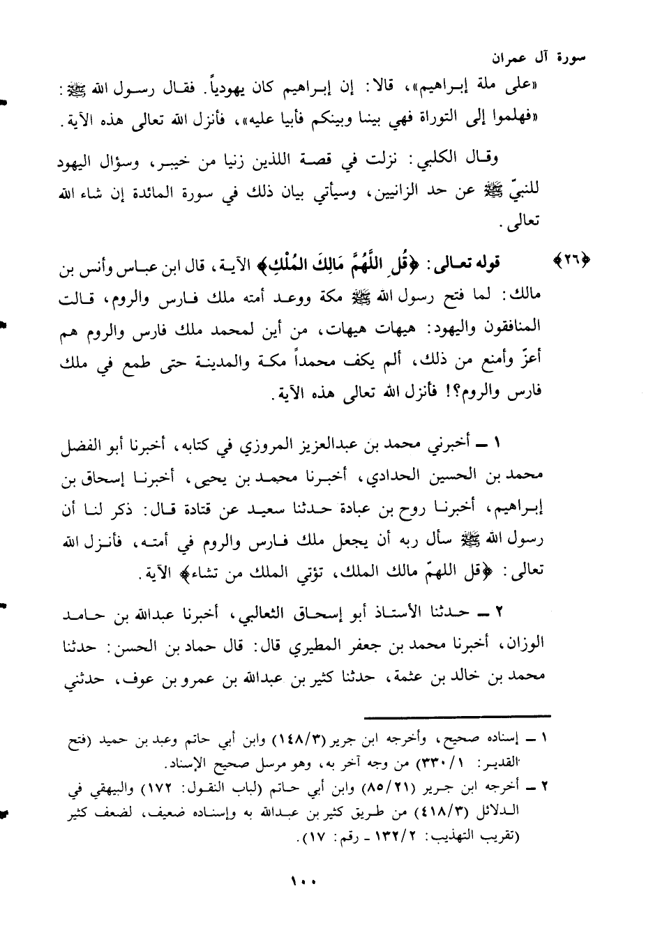 (¬1) - أَخْبَرَنِي مُحَمَّدُ بْنُ عَبْدِ الْعَزِيزِ الْمَرْوَزِيُّ فِي كِتَابِهِ، أَخْبَرَنَا أَبُو الْفَضْلِ مُحَمَّدُ بْنُ الْحُسَيْنِ الْحَدَّادِيُّ، أَخْبَرَنَا مُحَمَّدُ بْنُ يَحْيَى، أَخْبَرَنَا إِسْحَاقُ بْنُ إِبْرَاهِيمَ، أَخْبَرَنَا رَوْحُ بْنُ عُبَادَةَ حَدَّثَنَا سَعِيدٌ عَنْ قَتَادَةَ قَالَ: ذُكِرَ لَنَا أَنَّ رَسُولَ اللَّهِ - صَلَّى اللهُ عَلَيْهِ وَسَلَّمَ - سَأَلَ رَبَّهُ أَنْ يَجْعَلَ مُلْكَ فَارِسَ وَالرُّومِ فِي أُمَّتِهِ، فَأَنْزَلَ اللَّهُ تَعَالَى: {قُلِ اللَّهُمَّ مَالِكَ الْمُلْكِ تُؤْتِي الْمُلْكَ مَنْ تَشَاءُ} الْآيَةَ.
