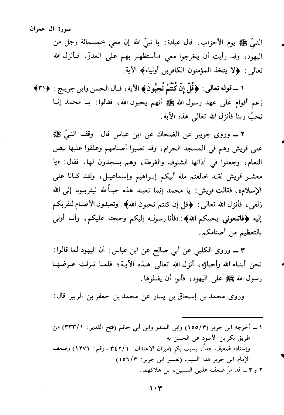 (¬2) - وَرَوَى جُوَيْبِرٌ عَنِ الضَّحَّاكِ عَنِ ابْنِ عَبَّاسٍ قَالَ: وَقَفَ النَّبِيُّ - صَلَّى اللهُ عَلَيْهِ وَسَلَّمَ - عَلَى قُرَيْشٍ وَهُمْ فِي الْمَسْجِدِ الْحَرَامِ، وَقَدْ نَصَبُوا أَصْنَامَهُمْ وَعَلَّقُوا عَلَيْهَا بَيْضَ النَّعَامِ، وَجَعَلُوا فِي آذَانِهَا الشُّنُوفَ وَالْقِرَطَةَ، وَهُمْ يَسْجُدُونَ لَهَا، فَقَالَ: "يَا مَعْشَرَ قُرَيْشٍ لَقَدْ خَالَفْتُمْ مِلَّةَ أَبِيكُمْ إِبْرَاهِيمَ وَإِسْمَاعِيلَ، وَلَقَدْ كَانَا عَلَى الْإِسْلَامِ"، فَقَالَتْ قُرَيْشٌ: يَا مُحَمَّدُ إِنَّمَا نَعْبُدُ هَذِهِ حُبًّا لِلَّهِ لِيُقَرِّبُونَا إِلَى اللَّهِ زُلْفَى، فَأَنْزَلَ اللَّهُ تَعَالَى: {قُلْ إِنْ كُنْتُمْ تُحِبُّونَ اللَّهَ} وَتَعْبُدُونَ الْأَصْنَامَ لِتُقَرِّبَكُمْ إِلَيْهِ {فَاتَّبِعُونِي يُحْبِبْكُمُ اللَّهُ} "فَأَنَا رَسُولُهُ إِلَيْكُمْ وَحُجَّتُهُ عَلَيْكُمْ، وَأَنَا أَوْلَى بِالتَّعْظِيمِ مِنْ أَصْنَامِكُمْ.