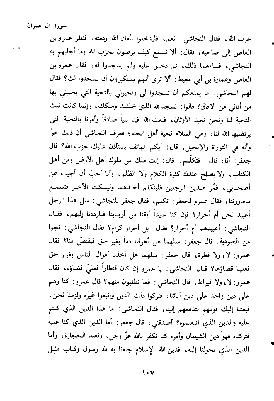 حِزْبُ اللَّهِ؟ قَالَ جَعْفَرٌ: أَنَا، قَالَ: فَتَكَلَّمْ. قَالَ: إِنَّكَ مَلِكٌ مِنْ مُلُوكِ أَهْلِ الْأَرْضِ وَمِنْ أَهْلِ الْكِتَابِ، وَلَا يَصْلُحُ عِنْدَكَ كَثْرَةُ الْكَلَامِ وَلَا الظُّلْمُ، وَأَنَا أُحِبُّ أَنْ أُجِيبَ عَنْ أَصْحَابِي، فَمُرْ هَذَيْنِ الرَّجُلَيْنِ فليتكلم أحدهما وليسكت الْآخَرُ فَتَسْمَعُ مُحَاوَرَتَنَا، فَقَالَ عَمْرٌو لِجَعْفَرٍ: تَكَلَّمْ، فَقَالَ جَعْفَرٌ لِلنَّجَاشِيِّ: سَلْ هَذَا الرَّجُلَ أَعَبِيدٌ نَحْنُ أَمْ أَحْرَارٌ؟ فَإِنْ كُنَّا عَبِيدًا أَبَقْنَا مِنْ أَرْبَابِنَا فَارْدُدْنَا إِلَيْهِمْ، فقال النجاشي: أعبيدهم أَمْ أَحْرَارٌ؟ فَقَالَ: بَلْ أَحْرَارٌ كِرَامٌ؟ فَقَالَ النَّجَاشِيُّ: نَجَوْا مِنَ الْعُبُودِيَّةِ. قَالَ جَعْفَرٌ: سَلْهُمَا هَلْ أَهْرَقْنَا دَمًا بِغَيْرِ حَقٍّ فَيُقْتَصُّ مِنَّا؟ فَقَالَ عَمْرٌو: لَا، وَلَا قَطْرَةٌ، قَالَ جَعْفَرٌ: سَلْهُمَا هَلْ أَخَذْنَا أَمْوَالَ النَّاسِ بِغَيْرِ حَقٍّ فَعَلَيْنَا قَضَاؤُهَا؟ قَالَ النَّجَاشِيُّ: يَا عَمْرُو إِنْ كَانَ قِنْطَارًا فَعَلَيَّ قَضَاؤُهُ، فَقَالَ عَمْرٌو: لا، ولا قيراط، قَالَ النَّجَاشِيُّ: فَمَا تَطْلُبُونَ مِنْهُمْ؟ قَالَ عَمْرٌو: كُنَّا وَهُمْ عَلَى دِينٍ وَاحِدٍ عَلَى دِينِ آبَائِنَا، فَتَرَكُوا ذَلِكَ الدِّينَ واتبعوا غيره ولزمنا نَحْنُ، فَبَعَثَنَا إِلَيْكَ قَوْمُهُمْ لِتَدْفَعَهُمْ إِلَيْنَا، فَقَالَ النَّجَاشِيُّ: مَا هَذَا الدِّينُ