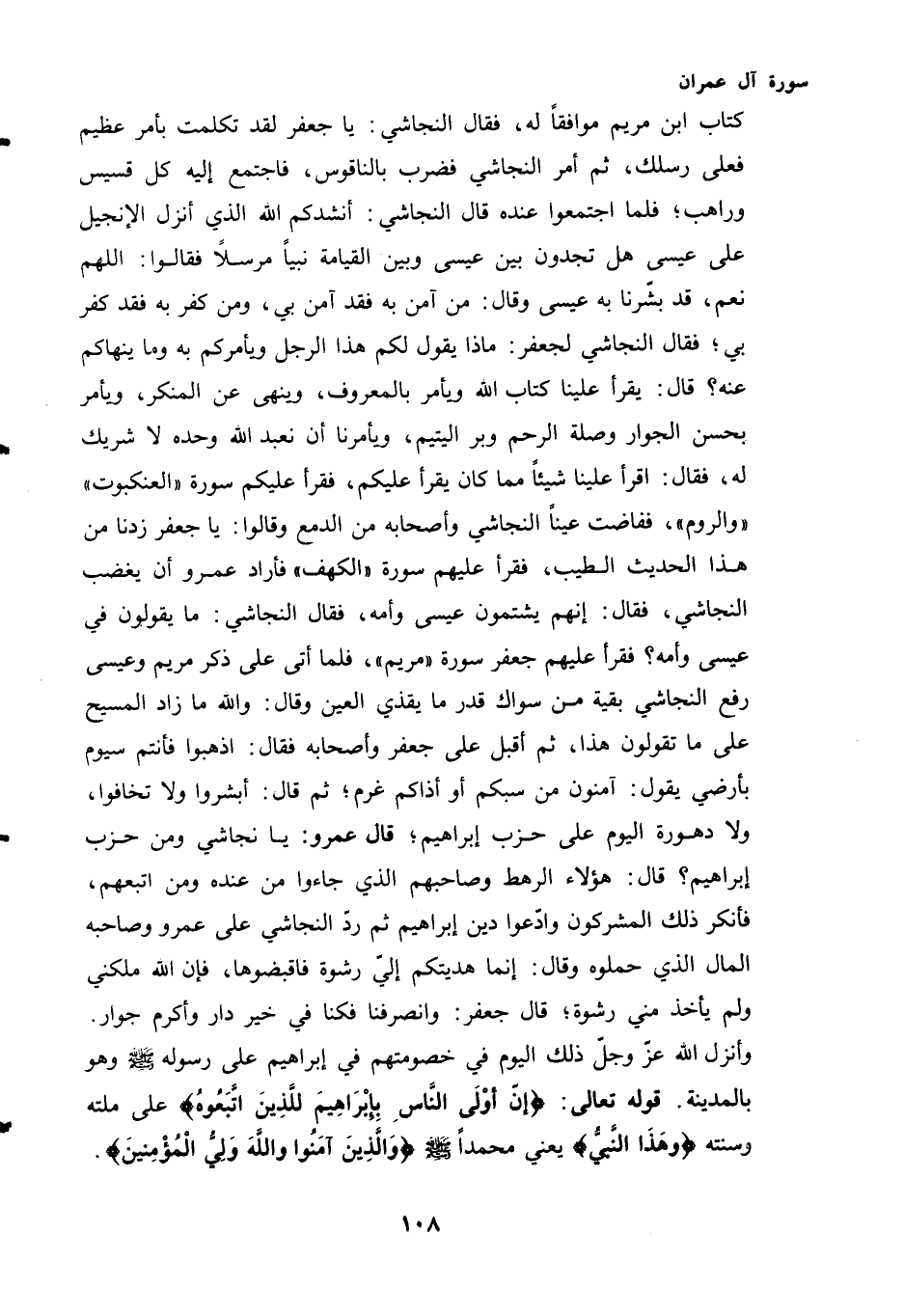 رِشْوَةً؛ قَالَ جعفر: وانصرفنا فكنا فِي خَيْرِ دَارٍ وَأَكْرَمِ جِوَارٍ. وَأَنْزَلَ اللَّهُ - عَزَّ وَجَلَّ - ذَلِكَ الْيَوْمَ فِي خُصُومَتِهِمْ فِي إِبْرَاهِيمَ عَلَى رَسُولِهِ - صَلَّى اللهُ عَلَيْهِ وَسَلَّمَ - وَهُوَ بِالْمَدِينَةِ قَوْلَهُ تَعَالَى: {إِنَّ أَوْلَى النَّاسِ بِإِبْرَاهِيمَ لَلَّذِينَ اتَّبَعُوهُ} عَلَى مِلَّتِهِ وَسُنَّتِهِ {وَهَذَا النَّبِيُّ} يَعْنِي مُحَمَّدًا - صَلَّى اللهُ عَلَيْهِ وَسَلَّمَ - {وَالَّذِينَ آمَنُوا وَاللَّهُ وَلِيُّ الْمُؤْمِنِينَ}