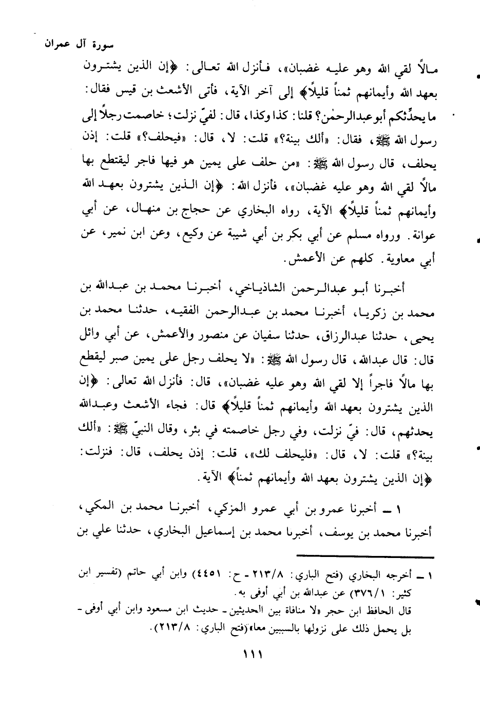 مَالًا لَقِيَ اللَّهَ وَهُوَ عَلَيْهِ غَضْبَانُ"، فَأَنْزَلَ اللَّهُ تَعَالَى: {إِنَّ الَّذِينَ يَشْتَرُونَ بِعَهْدِ اللَّهِ وَأَيْمَانِهِمْ ثَمَنًا قَلِيلًا} إِلَى آخِرِ الْآيَةِ، فَأَتَى الْأَشْعَثُ بْنُ قَيْسٍ فَقَالَ: مَا يُحَدِّثُكُمْ أَبُو عَبْدِ الرَّحْمَنِ؟ قُلْنَا: كَذَا وَكَذَا، قَالَ: لَفِيَّ نَزَلَتْ؛ خَاصَمْتُ رَجُلًا إِلَى رَسُولِ اللَّهِ - صَلَّى اللهُ عَلَيْهِ وَسَلَّمَ - فَقَالَ: "أَلَكَ بَيِّنَةٌ؟ " قُلْتُ: لَا، قَالَ: "فَيَحْلِفُ؟ " قُلْتُ: إِذَنْ يحلف، قال رسول الله - صَلَّى اللهُ عَلَيْهِ وَسَلَّمَ - "مَنْ حَلَفَ عَلَى يَمِينٍ هُوَ فِيهَا فَاجِرٌ لِيَقْتَطِعَ بِهَا مَالًا لَقِيَ اللَّهَ وَهُوَ عَلَيْهِ غَضْبَانُ"، فَأَنْزَلَ اللَّهُ: {إِنَّ الَّذِينَ يَشْتَرُونَ بِعَهْدِ اللَّهِ وَأَيْمَانِهِمْ ثَمَنًا قَلِيلًا} الْآيَةَ، رَوَاهُ الْبُخَارِيُّ عَنْ حَجَّاجِ بْنِ مِنْهَالٍ، عَنْ أَبِي عَوَانَةَ. وَرَوَاهُ مُسْلِمٌ عَنْ أَبِي بَكْرِ بْنِ أَبِي شَيْبَةَ عَنْ وَكِيعٍ، وَعَنِ ابْنِ نُمَيْرٍ، عَنْ أَبِي مُعَاوِيَةَ. كُلُّهُمْ عَنِ الْأَعْمَشِ.