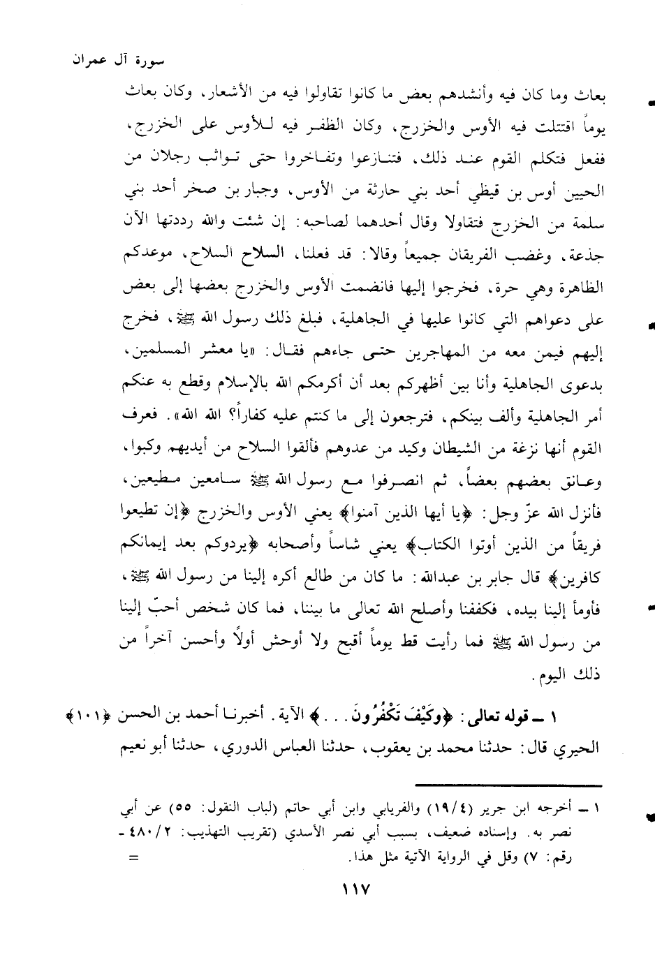 بُعَاثٍ وَمَا كَانَ فِيهِ، وَأَنْشِدْهُمْ بَعْضَ مَا كَانُوا تَقَاوَلُوا فِيهِ مِنَ الْأَشْعَارِ، وَكَانَ بُعَاثٌ يَوْمًا اقْتَتَلَتْ فِيهِ الْأَوْسُ والخزرج، وكان الظافر فِيهِ لِلْأَوْسِ عَلَى الْخَزْرَجِ، فَفَعَلَ فَتَكَلَّمَ الْقَوْمُ عِنْدَ ذَلِكَ، فَتَنَازَعُوا وَتَفَاخَرُوا حَتَّى تَوَاثَبَ رَجُلَانِ مِنَ الْحَيَّيْنِ أَوْسِ بْنِ قَيْظِيٍّ أَحَدِ بَنِي حَارِثَةَ مِنَ الْأَوْسِ، وَجَبَّارِ بْنِ صَخْرٍ أَحَدِ بَنِي سَلَمَةَ مِنَ الْخَزْرَجِ فَتَقَاوَلَا وَقَالَ أَحَدُهُمَا لِصَاحِبِهِ: إِنْ شِئْتَ وَاللَّهِ رَدَدْتُهَا الْآنَ جَذَعَةً، وَغَضِبَ الْفَرِيقَانِ جَمِيعًا وَقَالَا: قَدْ فَعَلْنَا، السِّلَاحَ السِّلَاحَ، مَوْعِدُكُمُ الظَّاهِرَةُ وَهِيَ حَرَّةٌ، فخرجوا إليها فانضمت الأوس والخزرخ بَعْضُهَا إِلَى بَعْضٍ عَلَى دَعْوَاهُمُ الَّتِي كَانُوا عَلَيْهَا فِي الْجَاهِلِيَّةِ، فَبَلَغَ ذَلِكَ رَسُولَ اللَّهِ - صَلَّى اللهُ عَلَيْهِ وَسَلَّمَ - فَخَرَجَ إِلَيْهِمْ فِيمَنْ مَعَهُ مِنَ الْمُهَاجِرِينَ حَتَّى جَاءَهُمْ فَقَالَ: "يَا معشر المسلمين، بدعوى الْجَاهِلِيَّةِ وَأَنَا بَيْنَ أَظْهُرِكُمْ بَعْدَ أَنْ أَكْرَمَكُمُ اللَّهُ بِالْإِسْلَامِ وَقَطَعَ بِهِ عَنْكُمْ أَمْرَ الْجَاهِلِيَّةِ وَأَلَّفَ بَيْنَكُمْ، فَتَرْجِعُونَ إِلَى مَا كُنْتُمْ عَلَيْهِ كُفَّارًا؟ اللَّهَ اللَّهَ". فَعَرَفَ الْقَوْمُ أَنَّهَا نَزْغَةٌ مِنَ الشَّيْطَانِ وَكَيْدٌ مِنَ عَدُوِّهِمْ فَأَلْقَوُا السِّلَاحَ من أيديهم وكبوا، وَعَانَقَ بَعْضُهُمْ بَعْضًا، ثُمَّ انْصَرَفُوا مَعَ رَسُولِ اللَّهِ - صَلَّى اللهُ عَلَيْهِ وَسَلَّمَ - سَامِعِينَ مُطِيعِينَ، فَأَنْزَلَ اللَّهُ - عز وجل - {يَا أَيُّهَا الَّذِينَ آمَنُوا} يَعْنِي الْأَوْسَ وَالْخَزْرَجَ {إِنْ تُطِيعُوا فَرِيقًا مِنَ الَّذِينَ أُوتُوا الْكِتَابَ} يَعْنِي شَاسًا وَأَصْحَابَهُ {يَرُدُّوكُمْ بَعْدَ إِيمَانِكُمْ كَافِرِينَ} قَالَ جَابِرُ بْنُ عَبْدِ اللَّهِ: مَا كَانَ مِنْ طَالِعٍ أَكْرَهَ إِلَيْنَا مِنْ رَسُولِ اللَّهِ - صَلَّى اللهُ عَلَيْهِ وَسَلَّمَ - فَأَوْمَأَ إِلَيْنَا بِيَدِهِ، فَكَفَفْنَا وَأَصْلَحَ اللَّهُ تَعَالَى مَا بَيْنَنَا، فَمَا كَانَ شَخْصٌ أَحَبَّ إِلَيْنَا مِنْ رَسُولِ اللَّهِ - صَلَّى اللهُ عَلَيْهِ وَسَلَّمَ - فَمَا رَأَيْتُ قَطُّ يَوْمًا أَقْبَحَ وَلَا أَوْحَشَ أَوَّلًا وَأَحْسَنَ آخِرًا مِنْ ذَلِكَ الْيَوْمِ.