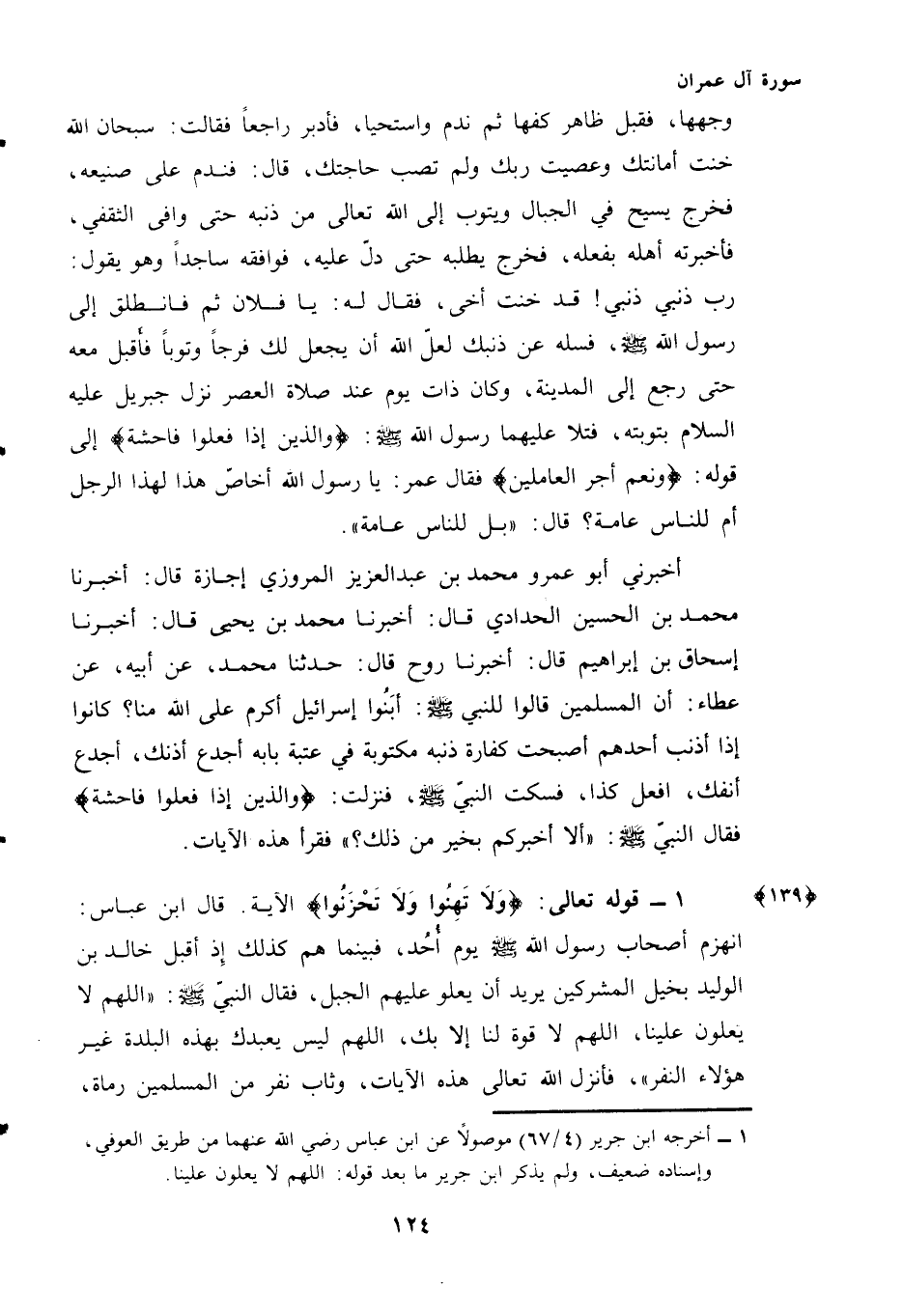 قَالَ ابْنُ عَبَّاسٍ: انْهَزَمَ أَصْحَابُ رَسُولِ اللَّهِ - صَلَّى اللهُ عَلَيْهِ وَسَلَّمَ - يوم أُحُد، فبينما هُمْ كَذَلِكَ إِذْ أَقْبَلَ خَالِدُ بْنُ الْوَلِيدِ بِخَيْلِ الْمُشْرِكِينَ يُرِيدُ أَنْ يَعْلُوَ عَلَيْهِمُ الْجَبَلَ، فَقَالَ النَّبِيُّ - صَلَّى اللهُ عَلَيْهِ وَسَلَّمَ - "اللَّهُمَّ لَا يَعْلُونَ عَلَيْنَا، اللَّهُمَّ لَا قُوَّةَ لَنَا إِلَّا بِكَ، اللَّهُمَّ لَيْسَ يَعْبُدُكَ بِهَذِهِ الْبَلْدَةِ غَيْرُ هَؤُلَاءِ النَّفَرِ"، فَأَنْزَلَ اللَّهُ تَعَالَى هَذِهِ الْآيَاتِ، وَثَابَ نَفَرٌ مِنَ الْمُسْلِمِينَ رُمَاةٌ،