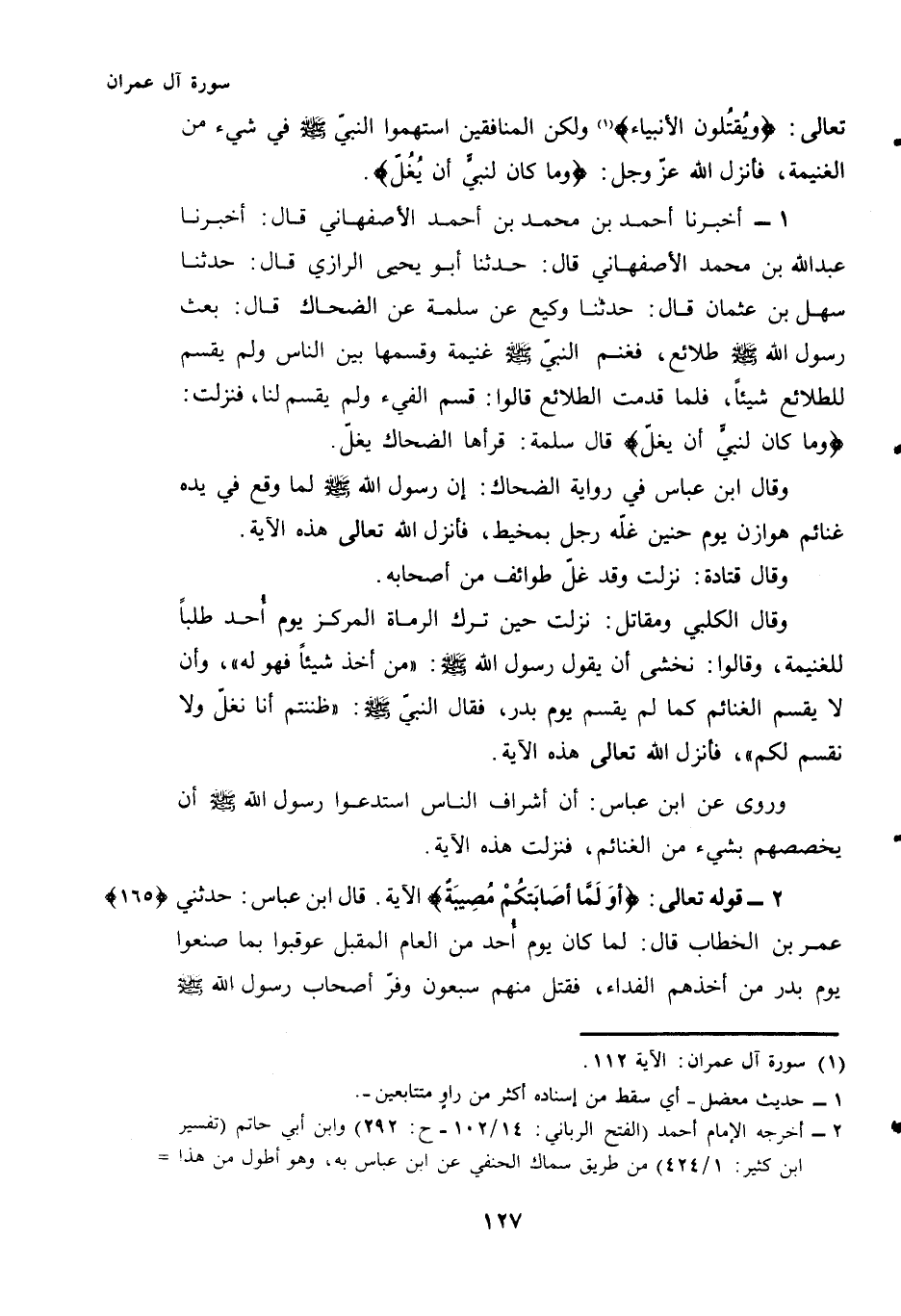 (¬2) - أَخْبَرَنَا أَحْمَدُ بْنُ مُحَمَّدِ بْنِ أحمد الأصفهاني قال: أَخْبَرَنَا عَبْدُ اللَّهِ بْنُ مُحَمَّدٍ الأصفهاني قال: حَدَّثَنَا أَبُو يَحْيَى الرازي قال: حَدَّثَنَا سَهْلُ بْنُ عثمان قال: حَدَّثَنَا وَكِيعٌ عَنْ سَلَمَةَ عَنِ الضَّحَّاكِ قَالَ: بَعَثَ رَسُولُ اللَّهِ - صَلَّى اللهُ عَلَيْهِ وَسَلَّمَ - طَلَائِعَ، فَغَنِمَ النَّبِيُّ - صَلَّى اللهُ عَلَيْهِ وَسَلَّمَ - غَنِيمَةً وَقَسَّمَهَا بَيْنَ النَّاسِ وَلَمْ يُقَسِّمْ لِلطَّلَائِعِ شَيْئًا، فَلَمَّا قَدِمَتِ الطَّلَائِعُ قَالُوا: قَسَّمَ الْفَيْءَ وَلَمْ يُقَسِّمْ لَنَا، فَنَزَلَتْ: {وَمَا كَانَ لِنَبِيٍّ أَنْ يَغُلَّ} قَالَ سَلَمَةُ: قَرَأَهَا الضَّحَّاكُ يُغَلَّ.