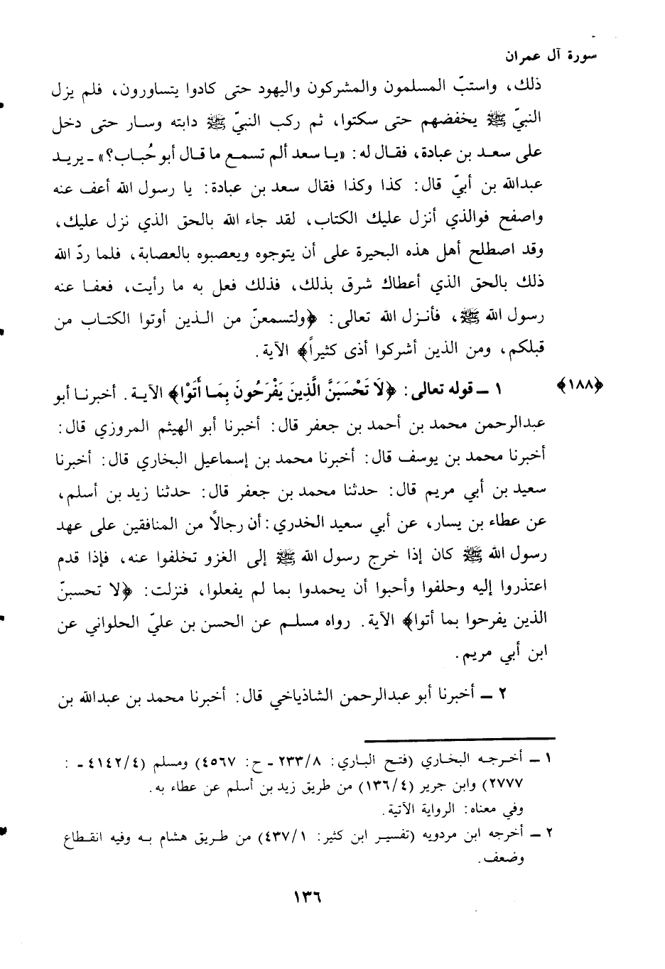 أَخْبَرَنَا أَبُو عَبْدِ الرَّحْمَنِ مُحَمَّدُ بْنُ أَحْمَدَ بن جعفر قال: أَخْبَرَنَا أَبُو الهيثم المروزي قال: أَخْبَرَنَا مُحَمَّدُ بن يوسف قال: أَخْبَرَنَا مُحَمَّدُ بْنُ إسماعيل البخاري قال: أَخْبَرَنَا سَعِيدُ بْنُ أبي مريم قال: حَدَّثَنَا مُحَمَّدُ بن جعفر قال: حَدَّثَنَا زَيْدُ بْنُ أَسْلَمَ، عَنْ عَطَاءِ بْنِ يَسَارٍ، عَنْ أَبِي سَعِيدٍ الْخُدْرِيِّ: أَنَّ رِجَالًا مِنَ الْمُنَافِقِينَ عَلَى عَهْدِ رَسُولِ اللَّهِ - صَلَّى اللهُ عَلَيْهِ وَسَلَّمَ - كَانَ إِذَا خَرَجَ رَسُولُ اللَّهِ - صَلَّى اللهُ عَلَيْهِ وَسَلَّمَ - إِلَى الْغَزْوِ تَخَلَّفُوا عَنْهُ، فَإِذَا قَدِمَ اعْتَذَرُوا إِلَيْهِ وَحَلَفُوا وَأَحَبُّوا أَنْ يُحْمَدُوا بِمَا لَمْ يَفْعَلُوا، فَنَزَلَتْ: {لَا تَحْسَبَنَّ الَّذِينَ يَفْرَحُونَ بِمَا أَتَوْا} الْآيَةَ. رَوَاهُ مُسْلِمٌ عَنِ الْحَسَنِ بْنِ عَلِيٍّ الْحُلْوَانِيِّ عَنِ ابْنِ أَبِي مَرْيَمَ.