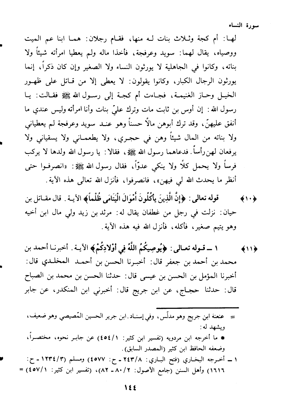 فَأَخَذَا مَالَهُ وَلَمْ يُعْطِيَا امْرَأَتَهُ شيئًا وَلَا بَنَاتَهُ، وَكَانُوا فِي الْجَاهِلِيَّةِ لَا يُوَرِّثُونَ النِّسَاءَ وَلَا الصَّغِيرَ وَإِنْ كَانَ ذَكَرًا، إِنَّمَا يُوَرِّثُونَ الرِّجَالَ الْكِبَارَ، وَكَانُوا يَقُولُونَ: لَا يُعْطَى إِلَّا مَنْ قاتل على ظهور الْخَيْلِ وَحَازَ الْغَنِيمَةَ، فجاءت أم كجة إِلَى رَسُولِ اللَّهِ - صَلَّى اللهُ عَلَيْهِ وَسَلَّمَ - فَقَالَتْ: يَا رَسُولَ اللَّهِ: إِنَّ أَوْسَ بْنَ ثَابِتٍ مَاتَ وَتَرَكَ عَلَيَّ بَنَاتٍ وَأَنَا امْرَأَتُهُ وَلَيْسَ عِنْدِي مَا أُنْفِقُ عَلَيْهِنَّ، وَقَدْ تَرَكَ أَبُوهُنَّ مَالًا حَسَنًا وَهُوَ عِنْدَ سُوَيْدٍ وَعَرْفَجَةَ لَمْ يُعْطِيَانِي وَلَا بَنَاتِهِ مِنَ الْمَالِ شَيْئًا وَهُنَّ فِي حِجْرِي، وَلَا يُطْعِمَانِي وَلَا يَسْقِيَانِي وَلَا يَرْفَعَانِ لَهُنَّ رَأْسًا. فَدَعَاهُمَا رَسُولُ اللَّهِ - صَلَّى اللهُ عَلَيْهِ وَسَلَّمَ - فَقَالَا: يَا رَسُولَ اللَّهِ وَلَدُهَا لَا يَرْكَبُ فَرَسًا وَلَا يَحْمِلُ كَلًّا وَلَا يُنْكِي عَدُوًّا، فَقَالَ رَسُولُ اللَّهِ - صَلَّى اللهُ عَلَيْهِ وَسَلَّمَ - "انْصَرِفُوا حَتَّى أَنْظُرَ مَا يُحْدِثُ اللَّهُ لِي فِيهِنَّ"، فَانْصَرَفُوا، فَأَنْزَلَ اللَّهُ تَعَالَى هَذِهِ الْآيَةَ.