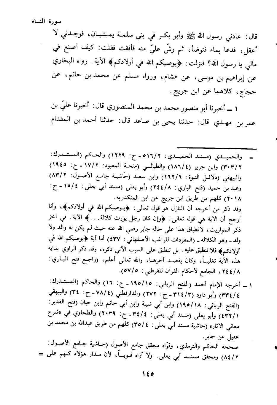 قَالَ: عَادَنِي رَسُولُ اللَّهِ - صَلَّى اللهُ عَلَيْهِ وَسَلَّمَ - وَأَبُو بَكْرٍ فِي بَنِي سَلَمَةَ يَمْشِيَانِ، فَوَجَدَنِي لَا أَعْقِلُ، فَدَعَا بِمَاءٍ فَتَوَضَّأَ، ثُمَّ رَشَّ عَلَيَّ مِنْهُ فَأَفَقْتُ فَقُلْتُ: كَيْفَ أَصْنَعُ فِي مَالِي يَا رَسُولَ اللَّهِ؟ فَنَزَلَتْ: {يُوصِيكُمُ اللَّهُ فِي أَوْلَادِكُمْ} الْآيَةَ. رَوَاهُ الْبُخَارِيُّ عَنْ إِبْرَاهِيمَ بْنِ مُوسَى، عَنْ هِشَامٍ، وَرَوَاهُ مُسْلِمٌ عَنْ مُحَمَّدِ بْنِ حَاتِمٍ، عَنْ حَجَّاجٍ، كِلَاهُمَا عَنِ ابْنِ جُرَيْجٍ.