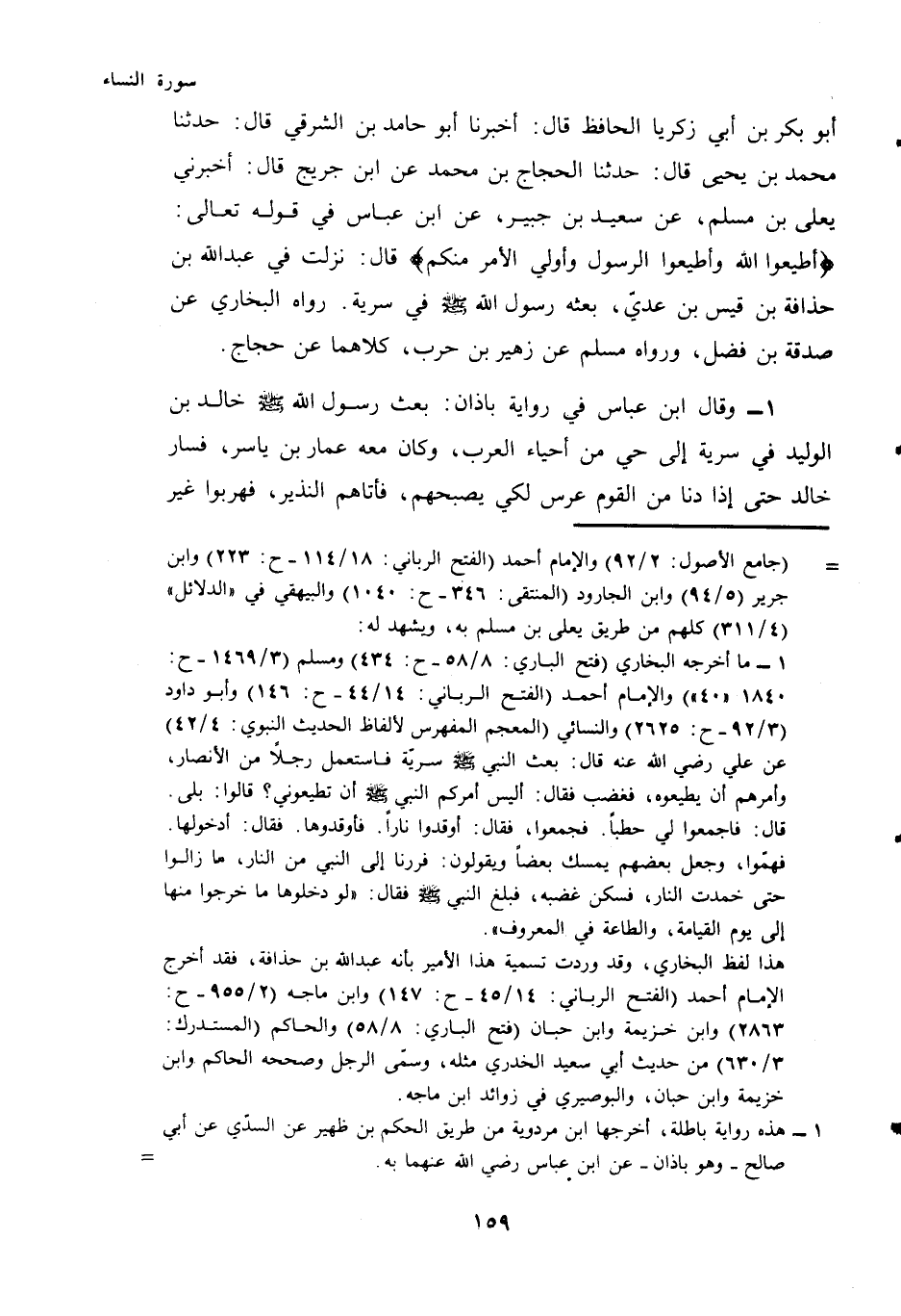 أَبُو بَكْرِ بْنُ أَبِي زَكَرِيَّا الْحَافِظُ قَالَ: أَخْبَرَنَا أَبُو حَامِدِ بْنُ الشَّرْقِيِّ قَالَ: حَدَّثَنَا مُحَمَّدُ بْنُ يَحْيَى قَالَ: حَدَّثَنَا الْحَجَّاجُ بْنُ مُحَمَّدٍ عَنِ ابْنِ جُرَيْجٍ قَالَ: أَخْبَرَنِي يَعْلَى بْنُ مُسْلِمٍ، عَنْ سَعِيدِ بْنِ جُبَيْرٍ، عَنِ ابْنِ عَبَّاسٍ فِي قَوْلِهِ تَعَالَى: {أَطِيعُوا اللَّهَ وَأَطِيعُوا الرَّسُولَ وَأُولِي الْأَمْرِ مِنْكُمْ} قَالَ: نَزَلَتْ فِي عَبْدِ اللَّهِ بْنِ حُذَافَةَ بْنِ قَيْسِ بْنِ عَدِيٍّ، بَعَثَهُ رَسُولُ اللَّهِ - صَلَّى اللهُ عَلَيْهِ وَسَلَّمَ - فِي سَرِيَّةٍ. رَوَاهُ الْبُخَارِيُّ عَنْ صدقة بن فضل، وَرَوَاهُ مُسْلِمٌ عَنْ زُهَيْرِ بْنِ حَرْبٍ، كِلَاهُمَا عَنْ حَجَّاجٍ.