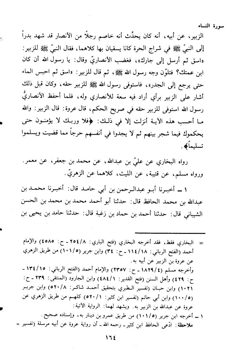 الزُّبَيْرِ، عَنْ أَبِيهِ، أَنَّهُ كَانَ يُحَدِّثُ أَنَّهُ خَاصَمَ رَجُلًا مِنَ الْأَنْصَارِ قَدْ شَهِدَ بَدْرًا إِلَى النَّبِيِّ - صَلَّى اللهُ عَلَيْهِ وَسَلَّمَ - فِي شِرَاجِ الْحَرَّةِ كَانَا يَسْقِيَانِ بِهَا كِلَاهُمَا، فَقَالَ النَّبِيُّ - صَلَّى اللهُ عَلَيْهِ وَسَلَّمَ - لِلزُّبَيْرِ: "اسْقِ ثُمَّ أَرْسِلْ إِلَى جَارِكَ"، فَغَضِبَ الْأَنْصَارِيُّ وَقَالَ: يَا رَسُولَ اللَّهِ، أَنْ كَانَ ابْنَ عَمَّتِكَ؟ فَتَلَوَّنَ وَجْهُ رَسُولِ اللَّهِ - صَلَّى اللهُ عَلَيْهِ وَسَلَّمَ - ثُمَّ قَالَ لِلزُّبَيْرِ: "اسْقِ ثُمَّ احْبِسِ الْمَاءَ حَتَّى يَرْجِعَ إِلَى الْجُدُرِ"، فَاسْتَوْفَى رَسُولُ اللَّهِ - صَلَّى اللهُ عَلَيْهِ وَسَلَّمَ - لِلزُّبَيْرِ حَقَّهُ، وَكَانَ قَبْلَ ذَلِكَ أَشَارَ عَلَى الزُّبَيْرِ بِرَأْيٍ أَرَادَ فِيهِ سَعَةً لِلْأَنْصَارِيِّ وَلَهُ، فَلَمَّا أَحْفَظَ الْأَنْصَارِيُّ رَسُولَ اللَّهِ اسْتَوْفَى لِلزُّبَيْرِ حَقَّهُ فِي صَرِيحِ الْحُكْمِ، قَالَ عُرْوَةُ: قَالَ الزُّبَيْرُ: وَاللَّهِ مَا أَحْسَبُ هَذِهِ الْآيَةَ أُنْزِلَتْ إِلَّا فِي ذَلِكَ: {فَلَا وَرَبِّكَ لَا يُؤْمِنُونَ حَتَّى يُحَكِّمُوكَ فِيمَا شَجَرَ بَيْنَهُمْ ثُمَّ لَا يَجِدُوا فِي أَنْفُسِهِمْ حَرَجًا مِمَّا قَضَيْتَ وَيُسَلِّمُوا تَسْلِيمًا} رَوَاهُ الْبُخَارِيُّ عَنْ عَلِيِّ بْنِ عَبْدِ اللَّهِ، عَنْ مُحَمَّدِ بْنِ جَعْفَرٍ، عَنْ مَعْمَرٍ وَرَوَاهُ مُسْلِمٌ، عَنْ قُتَيْبَةَ، عَنِ اللَّيْثِ، كِلَاهُمَا عَنِ الزُّهْرِيِّ.