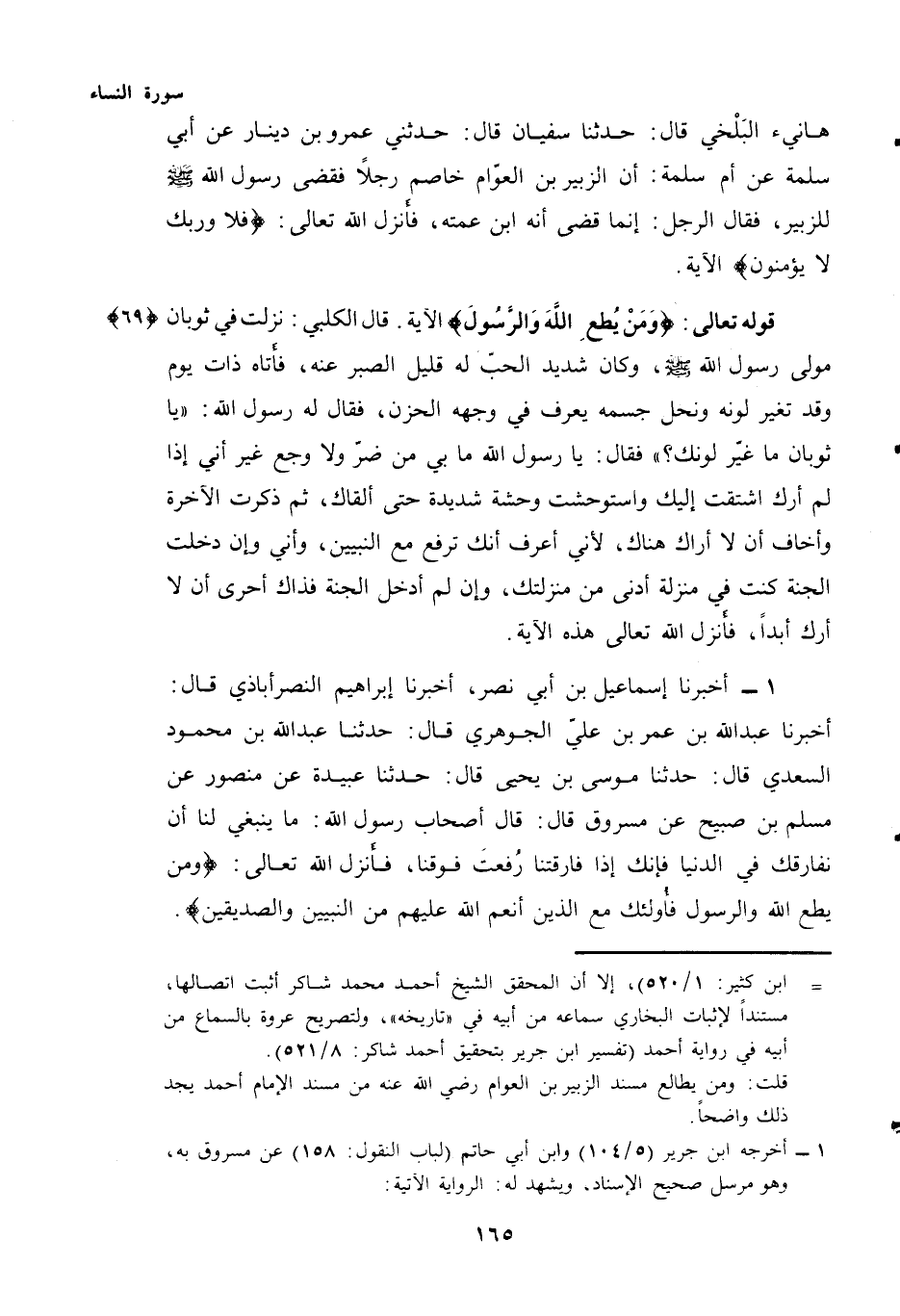 (¬1) - أَخْبَرَنَا إِسْمَاعِيلُ بْنُ أَبِي نَصْرٍ، أَخْبَرَنَا إِبْرَاهِيمُ النَّصْرَابَاذِيُّ قَالَ: أَخْبَرَنَا عَبْدُ اللَّهِ بْنُ عُمَرَ بْنِ عَلِيٍّ الْجَوْهَرِيُّ قَالَ: حَدَّثَنَا عَبْدُ اللَّهِ بْنُ مَحْمُودٍ السَّعْدِيُّ قَالَ: حَدَّثَنَا مُوسَى بْنُ يَحْيَى قَالَ: حَدَّثَنَا عُبَيْدَةُ عَنْ مَنْصُورٍ عَنْ مُسْلِمِ بْنِ صُبَيْحٍ عَنْ مَسْرُوقٍ قَالَ: قَالَ أَصْحَابُ رَسُولِ اللَّهِ: مَا يَنْبَغِي لَنَا أَنْ نُفَارِقَكَ فِي الدُّنْيَا فَإِنَّكَ إِذَا فَارَقْتَنَا رُفِعْتَ فَوْقَنَا، فَأَنْزَلَ اللَّهُ تَعَالَى: {وَمَنْ يُطِعِ اللَّهَ وَالرَّسُولَ فَأُولَئِكَ مَعَ الَّذِينَ أَنْعَمَ اللَّهُ عَلَيْهِمْ مِنَ النَّبِيِّينَ