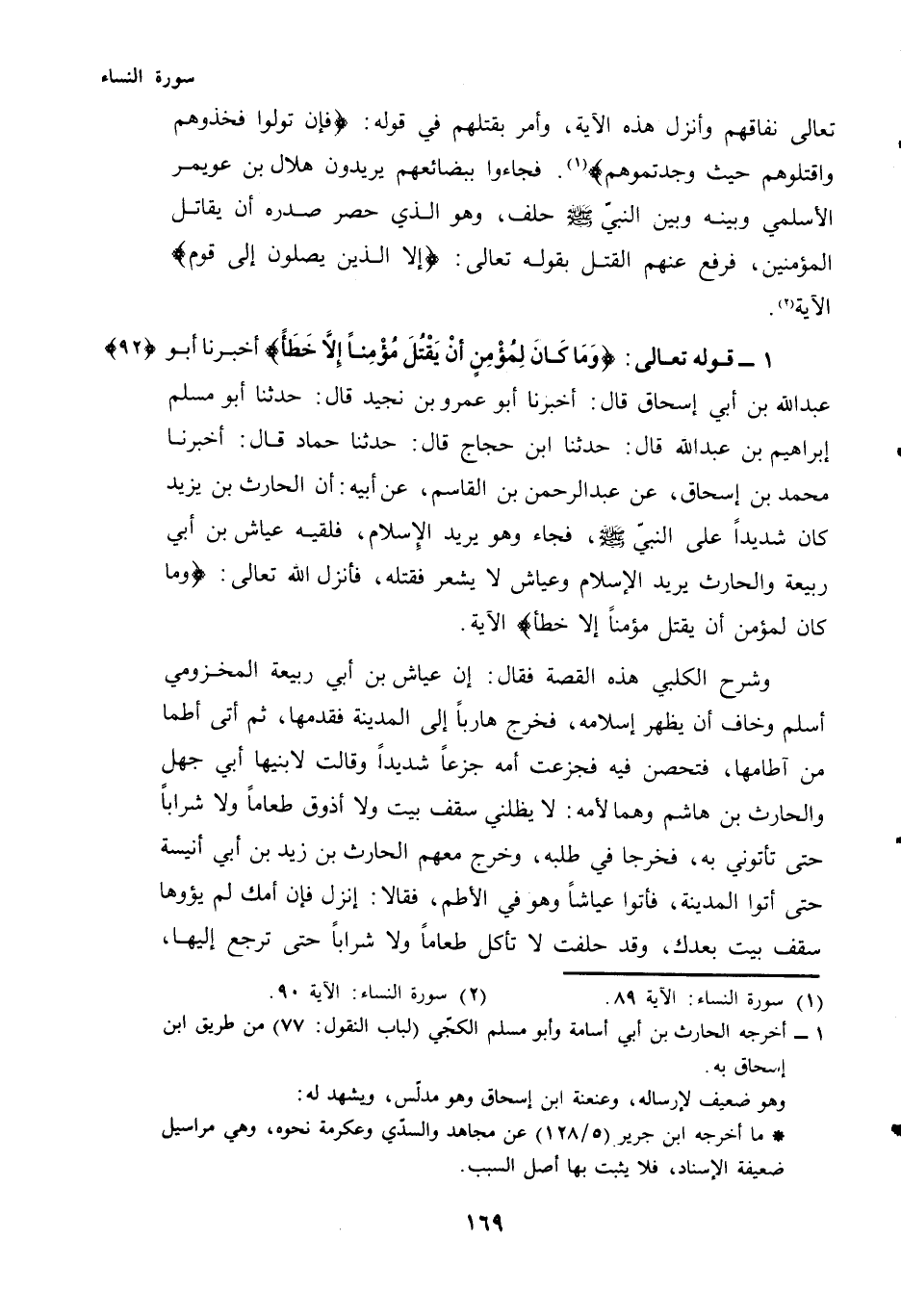أَخْبَرَنَا أَبُو عَبْدِ اللَّهِ بْنُ أَبِي إِسْحَاقَ قَالَ: أَخْبَرَنَا أَبُو عَمْرِو بْنُ نُجَيْدٍ قَالَ: حَدَّثَنَا أَبُو مُسْلِمٍ إِبْرَاهِيمُ بْنُ عَبْدِ اللَّهِ قَالَ: حَدَّثَنَا ابْنُ حَجَّاجٍ قَالَ: حَدَّثَنَا حَمَّادٌ قَالَ: أَخْبَرَنَا مُحَمَّدُ بْنُ إِسْحَاقَ، عَنْ عَبْدِ الرَّحْمَنِ بْنِ الْقَاسِمِ، عَنْ أَبِيهِ: أَنَّ الْحَارِثَ بْنَ يَزِيدَ كَانَ شَدِيدًا عَلَى النَّبِيِّ - صَلَّى اللهُ عَلَيْهِ وَسَلَّمَ - فَجَاءَ وَهُوَ يُرِيدُ الْإِسْلَامَ، فَلَقِيَهُ عَيَّاشُ بْنُ أَبِي رَبِيعَةَ وَالْحَارِثُ يُرِيدُ الْإِسْلَامَ وَعَيَّاشُ لَا يَشْعُرُ فَقَتَلَهُ، فَأَنْزَلَ اللَّهُ تَعَالَى: {وَمَا كَانَ لِمُؤْمِنٍ أَنْ يَقْتُلَ مُؤْمِنًا إِلَّا خَطَأً} الْآيَةَ.