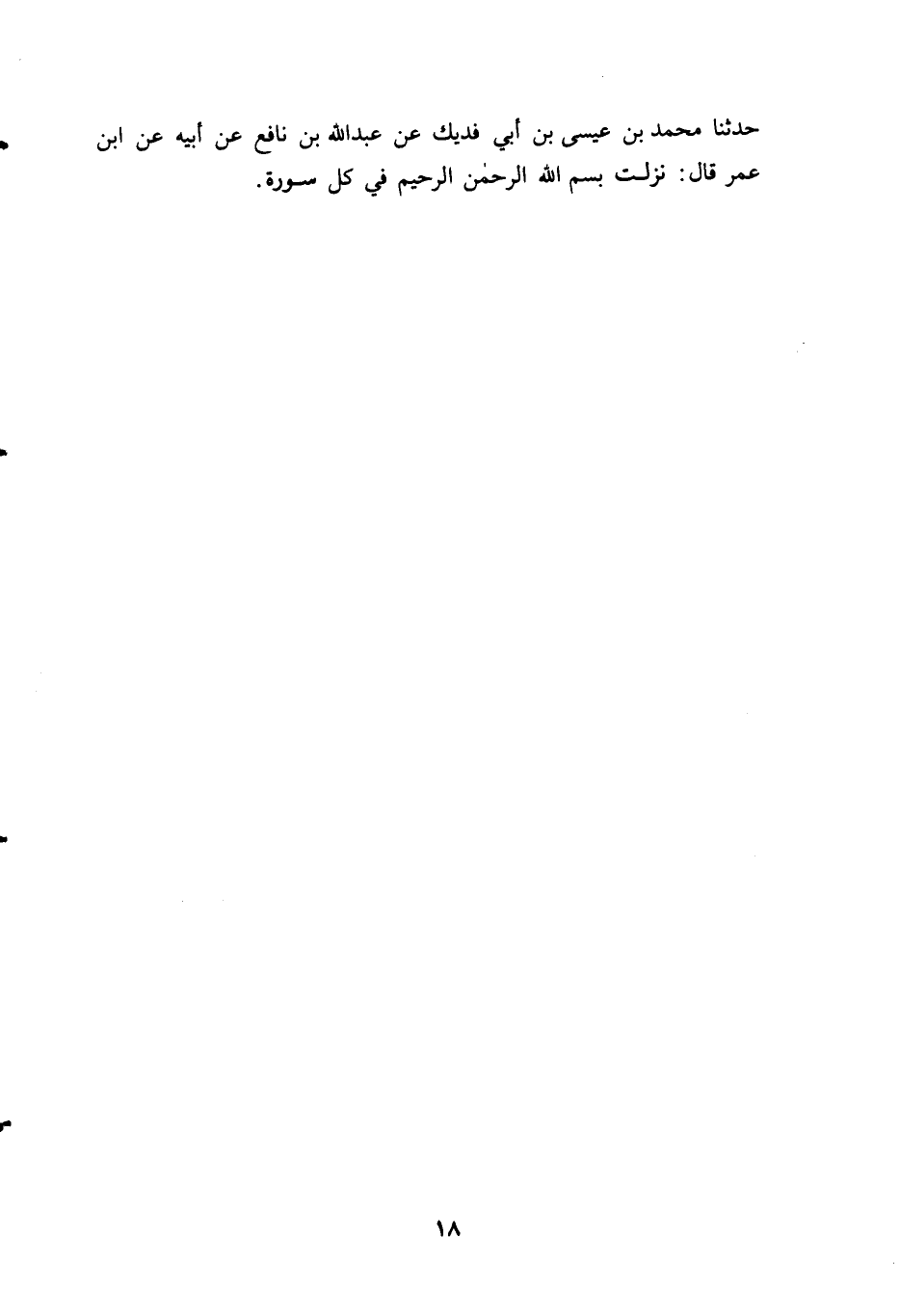 حَدَّثَنَا مُحَمَّدُ بْنُ عِيسَى بْنِ أَبِي فُدَيْكٍ عَنْ عَبْدِ اللَّهِ بْنِ نَافِعٍ عَنْ أَبِيهِ عَنِ ابْنِ عُمَرَ قَالَ: نَزَلَتْ {بِسْمِ اللَّهِ الرَّحْمَنِ الرَّحِيمِ} فِي كُلِّ سُورَةٍ.