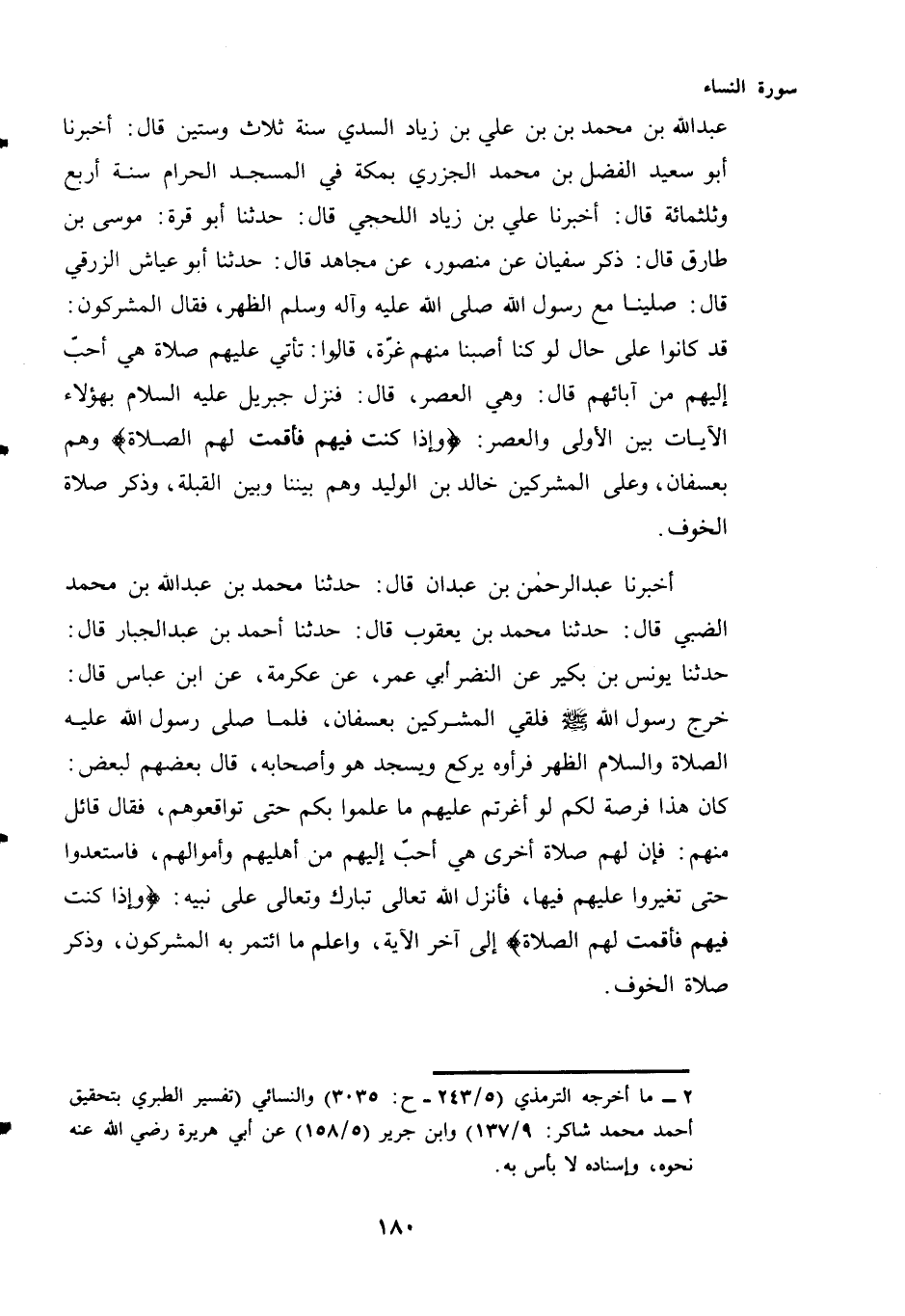 عَبْدُ اللَّهِ بْنُ مُحَمَّدِ بْنِ عَلِيِّ بْنِ زِيَادٍ السُّدِّيُّ سَنَةَ ثَلَاثٍ وَسِتِّينَ قَالَ: أَخْبَرَنَا أَبُو سَعِيدٍ الْفَضْلُ بْنُ مُحَمَّدٍ الْجَزَرِيُّ بِمَكَّةَ فِي الْمَسْجِدِ الْحَرَامِ سنة أربع وثلثمائة قَالَ: أَخْبَرَنَا عَلِيُّ بْنُ زِيَادٍ اللَّحْجِيُّ قَالَ: حَدَّثَنَا أَبُو قُرَّةَ: مُوسَى بْنُ طَارِقٍ قَالَ: ذَكَرَ سُفْيَانُ عَنْ مَنْصُورٍ، عَنْ مجاهد قال: حدثنا أَبُو عَيَّاشٍ الزُّرَقِيُّ قَالَ: صَلَّيْنَا مَعَ رَسُولِ اللَّهِ صَلَّى اللهُ عَلَيْهِ وَآلِهِ وَسَلَّمَ الظُّهْرَ، فَقَالَ الْمُشْرِكُونَ: قَدْ كَانُوا عَلَى حَالٍ لَوْ كُنَّا أَصَبْنَا مِنْهُمْ غِرَّةً، قَالُوا: تَأْتِي عَلَيْهِمْ صَلَاةٌ هِيَ أَحَبُّ إِلَيْهِمْ مِنْ آبَائِهِمْ قَالَ: وهي العصر، قال: فَنَزَلَ جِبْرِيلُ عَلَيْهِ السَّلَامُ بِهَؤُلَاءِ الْآيَاتِ بَيْنَ الْأُولَى وَالْعَصْرِ: {وَإِذَا كُنْتَ فِيهِمْ فَأَقَمْتَ لَهُمُ الصَّلَاةَ} وَهُمْ بِعُسْفَانَ، وَعَلَى الْمُشْرِكِينَ خَالِدُ بْنُ الْوَلِيدِ وَهُمْ بَيْنَنَا وَبَيْنَ الْقِبْلَةِ، وَذَكَرَ صَلَاةَ الْخَوْفِ. أَخْبَرَنَا عَبْدُ الرَّحْمَنِ بْنُ عَبْدَانَ قَالَ: حَدَّثَنَا مُحَمَّدُ بْنُ عَبْدِ اللَّهِ بْنِ مُحَمَّدٍ الضَّبِّيُّ قَالَ: حَدَّثَنَا مُحَمَّدُ بْنُ يَعْقُوبَ قَالَ: حَدَّثَنَا أَحْمَدُ بْنُ عَبْدِ الْجَبَّارِ قَالَ: حَدَّثَنَا يُونُسُ بْنُ بُكَيْرٍ عَنِ النَّضْرِ أَبِي عُمَرَ، عَنْ عِكْرِمَةَ، عَنِ ابْنِ عَبَّاسٍ قَالَ: خَرَجَ رَسُولُ اللَّهِ - صَلَّى اللهُ عَلَيْهِ وَسَلَّمَ - فَلَقِيَ الْمُشْرِكِينَ بِعُسْفَانَ، فَلَمَّا صَلَّى رَسُولُ الله عليه الصلاة والسلام الظُّهْرَ فَرَأَوْهُ يَرْكَعُ وَيَسْجُدُ هُوَ وَأَصْحَابُهُ، قَالَ بَعْضُهُمْ لِبَعْضٍ: كَانَ هَذَا فُرْصَةً لَكُمْ لَوْ أَغَرْتُمْ عَلَيْهِمْ مَا عَلِمُوا بِكُمْ حَتَّى تُوَاقِعُوهُمْ، فَقَالَ قَائِلٌ مِنْهُمْ: فَإِنَّ لَهُمْ صَلَاةً أُخْرَى هِيَ أَحَبُّ إِلَيْهِمْ مِنْ أَهْلِيهِمْ وَأَمْوَالِهِمْ، فَاسْتَعِدُّوا حَتَّى تُغِيرُوا عَلَيْهِمْ فِيهَا، فَأَنْزَلَ الله تعالى تَبَارَكَ وَتَعَالَى عَلَى نَبِيِّهِ: {وَإِذَا كُنْتَ فِيهِمْ فَأَقَمْتَ لَهُمُ الصَّلَاةَ} إِلَى آخِرِ الْآيَةِ، وَأَعْلَمَ مَا ائْتَمَرَ بِهِ الْمُشْرِكُونَ، وَذَكَرَ صَلَاةَ الْخَوْفِ.