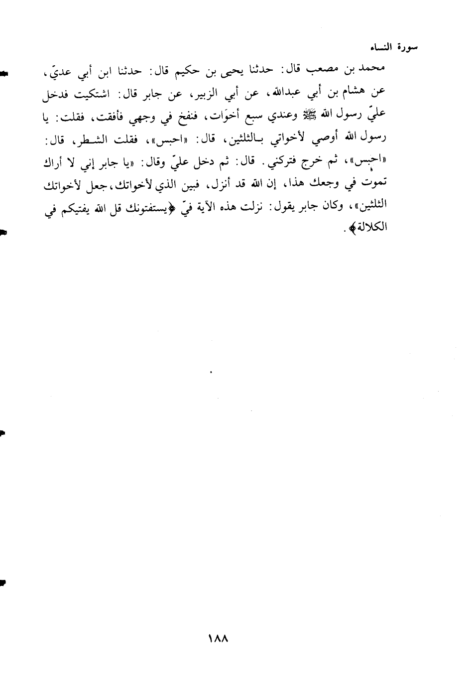 مُحَمَّدِ بْنِ مُصْعَبٍ قَالَ: حَدَّثَنَا يَحْيَى بْنُ حَكِيمٍ قَالَ: حَدَّثَنَا ابْنُ أَبِي عَدِيٍّ، عَنْ هِشَامِ بْنِ أَبِي عَبْدِ اللَّهِ، عَنْ أَبِي الزُّبَيْرِ، عَنْ جَابِرٍ قَالَ: اشْتَكَيْتُ فَدَخَلَ عَلَيَّ رَسُولُ اللَّهِ - صَلَّى اللهُ عَلَيْهِ وَسَلَّمَ - وَعِنْدِي سَبْعُ أَخَوَاتٍ، فَنَفَخَ فِي وَجْهِي فَأَفَقْتُ، فَقُلْتُ: يَا رَسُولَ اللَّهِ أُوصِي لِأَخَوَاتِي بِالثُّلُثَيْنِ، قَالَ: "احْبِسْ"، فَقُلْتُ الشَّطْرُ، قَالَ: "احْبِسْ"، ثُمَّ خَرَجَ فَتَرَكَنِي. قَالَ: ثُمَّ دَخَلَ عَلَيَّ وَقَالَ: "يَا