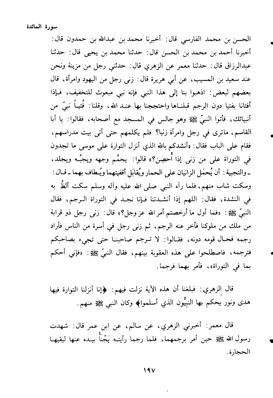 عَنْ أَبِي هُرَيْرَةَ قَالَ: زَنَى رَجُلٌ مِنَ اليهود وامرأة، قال بَعْضُهُمْ لِبَعْضٍ: اذْهَبُوا بِنَا إِلَى هَذَا النَّبِيِّ فَإِنَّهُ نَبِيٌّ مَبْعُوثٌ لِلتَّخْفِيفِ، فَإِذَا أَفْتَانَا بِفُتْيَا دُونَ الرَّجْمِ قَبِلْنَاهَا وَاحْتَجَجْنَا بِهَا عِنْدَ اللَّهِ، وَقُلْنَا: فُتْيَا نَبِيٍّ مِنْ أَنْبِيَائِكَ، فَأَتَوُا النَّبِيَّ - صَلَّى اللهُ عَلَيْهِ وَسَلَّمَ - وَهُوَ جَالِسٌ فِي الْمَسْجِدِ مَعَ أَصْحَابِهِ، فَقَالُوا: يَا أَبَا الْقَاسِمِ، مَا تَرَى فِي رَجُلٍ وَامْرَأَةٍ زَنَيَا؟ فَلَمْ يُكَلِّمْهُمْ حَتَّى أَتَى بَيْتَ مِدْرَاسِهِمْ، فَقَامَ عَلَى الْبَابِ فَقَالَ: "أَنْشُدُكُمْ بِاللَّهِ الذي أنزل التوارة عَلَى مُوسَى مَا تَجِدُونَ فِي التَّوْرَاةِ عَلَى مَنْ زَنَى إِذَا أُحْصِنَ؟ " قَالُوا: يُحَمَّمُ وَجْهُهُ وَيُجَبَّهُ وَيُجْلَدُ، - وَالتَّجْبِيهُ: أَنْ يُحْمَلَ الزانيان على الحمار ويُقابَل أَقْفِيَتُهُمَا وَيُطَافَ بِهِمَا - قَالَ: وَسَكَتَ شَابٌّ مِنْهُمْ، فَلَمَّا رَآهُ النَّبِيُّ صَلَّى اللهُ عَلَيْهِ وَآلِهِ وَسَلَّمَ سَكَتَ أَلَظَّ بِهِ فِي النِّشْدَةِ، فقال: اللهم إذا أَنْشَدْتَنَا فَإِنَّا نَجِدُ فِي التَّوْرَاةِ الرَّجْمَ، فَقَالَ النَّبِيُّ - صَلَّى اللهُ عَلَيْهِ وَسَلَّمَ - "فَمَا أَوَّلُ مَا أَرْخَصْتُمْ أَمْرَ اللَّهِ عَزَّ وَجَلَّ؟ " قَالَ: زَنَى رَجُلٌ ذُو قُرَابَةٍ مِنْ مَلِكٍ مِنْ مُلُوكِنَا فَأَخَّرَ عَنْهُ الرَّجْمَ، ثُمَّ زَنَى رَجُلٌ فِي أُسْرَةٍ مِنَ النَّاسِ فَأَرَادَ رَجْمَهُ فَحَالَ قَوْمُهُ دُونَهُ، فَقَالُوا: لَا تَرْجُمْ صَاحِبَنَا حَتَّى تَجِيءَ بِصَاحِبِكُمْ فَتَرْجُمَهُ، فَاصْطَلَحُوا عَلَى هَذِهِ الْعُقُوبَةِ بَيْنَهُمْ، فَقَالَ النَّبِيُّ - صَلَّى اللهُ عَلَيْهِ وَسَلَّمَ - "فَإِنِّي أَحْكُمُ بِمَا فِي التَّوْرَاةِ"، فَأَمَرَ بِهِمَا فَرُجِمَا.