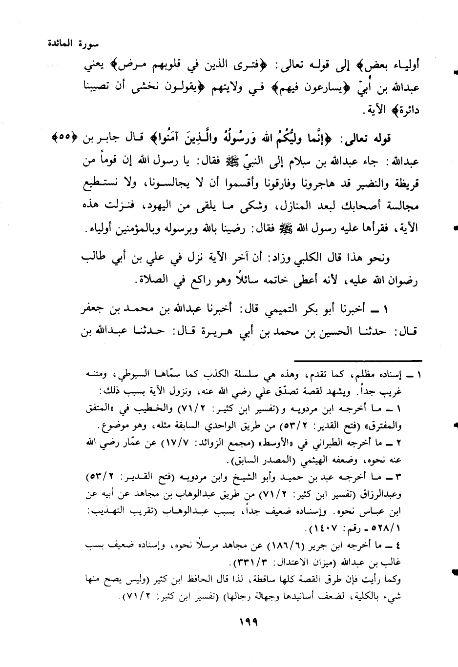 (¬1) - إسناده مظلم، كما تقدم، وهذه هي سلسلة الكذب كما سَمّاها السيوطي، ومتنه غريب جدًّا. ويشهد لقصة تصدّق علي رضي الله عنه، ونزول الآية بسبب ذلك: