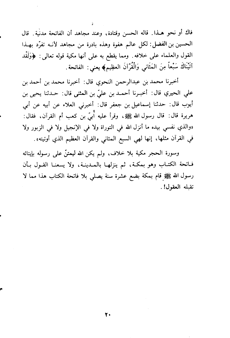 أَخْبَرَنَا مُحَمَّدُ بْنُ عَبْدِ الرحمن النحوي قال: أَخْبَرَنَا مُحَمَّدُ بْنُ أَحْمَدَ بْنِ عليّ الحيري قال: أَخْبَرَنَا أَحْمَدُ بْنُ عَلِيِّ بن المثنى قال: حَدَّثَنَا يَحْيَى بن أيوب قال: حَدَّثَنَا إِسْمَاعِيلُ بن جعفر قال: أَخْبَرَنِي الْعَلَاءُ عَنْ أَبِيهِ عَنْ أَبِي هُرَيْرَةَ قَالَ: قَالَ رَسُولُ اللَّهِ - صَلَّى اللهُ عَلَيْهِ وَسَلَّمَ - وَقَرَأَ عَلَيْهِ أُبَيُّ بْنُ كَعْبٍ أُمَّ الْقُرْآنِ، فَقَالَ: "وَالَّذِي نَفْسِي بِيَدِهِ مَا أَنْزَلَ اللَّهُ فِي التَّوْرَاةِ وَلَا فِي الْإِنْجِيلِ وَلَا فِي الزَّبُورِ وَلَا فِي الْقُرْآنِ مِثْلَهَا، إِنَّهَا لَهِيَ السَّبْعُ الْمَثَانِي وَالْقُرْآنُ الْعَظِيمُ الَّذِي أُوتِيتُهُ". وَسُورَةُ الْحِجْرِ مَكِّيَّةٌ بِلَا خِلَافٍ، وَلَمْ يَكُنِ اللَّهُ لِيَمْتَنَّ عَلَى رَسُولِهِ بِإِيتَائِهِ فَاتِحَةَ الْكِتَابِ وَهُوَ بِمَكَّةَ، ثُمَّ يُنْزِلُهَا بِالْمَدِينَةِ وَلَا يَسَعُنَا الْقَوْلُ بِأَنَّ رَسُولَ اللَّهِ - صَلَّى اللهُ عَلَيْهِ وَسَلَّمَ - قَامَ بِمَكَّةَ بِضْعَ عَشْرَةَ سَنَةً يُصَلِّي بِلَا فَاتِحَةِ الْكِتَابِ هَذَا مِمَّا لَا تَقْبَلُهُ الْعُقُولُ!.