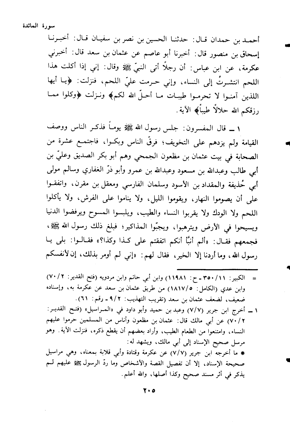 (¬1) - قَالَ الْمُفَسِّرُونَ: جَلَسَ رَسُولُ اللَّهِ - صَلَّى اللهُ عَلَيْهِ وَسَلَّمَ - يَوْمًا فَذَكَّرَ النَّاسَ وَوَصَفَ الْقِيَامَةَ وَلَمْ يَزِدْهُمْ عَلَى التَّخْوِيفِ؛ فَرَقَّ النَّاسُ وَبَكَوْا، فَاجْتَمَعَ عَشَرَةٌ مِنَ الصَّحَابَةِ فِي بَيْتِ عُثْمَانَ بْنِ مَظْعُونٍ الْجُمَحِيِّ وَهُمْ أَبُو بَكْرٍ الصِّدِّيقُ وَعَلِيُّ بْنُ أَبِي طَالِبٍ وَعَبْدُ اللَّهِ بْنُ مَسْعُودٍ وَعَبْدُ اللَّهِ بْنُ عَمْرٍو وَأَبُو ذَرٍّ الْغِفَارِيُّ وَسَالِمٌ مَوْلَى أَبِي حُذَيْفَةَ وَالْمِقْدَادُ بْنُ الْأَسْوَدِ وَسَلْمَانُ الْفَارِسِيُّ وَمَعْقِلُ بْنُ مُقَرِّنٍ، وَاتَّفَقُوا عَلَى أَنْ يَصُومُوا النَّهَارَ، وَيَقُومُوا اللَّيْلَ، وَلَا يَنَامُوا عَلَى الْفُرُشِ، وَلَا يَأْكُلُوا اللَّحْمَ وَلَا الْوَدَكَ وَلَا يَقْرَبُوا النِّسَاءَ وَالطِّيبَ، وَيَلْبَسُوا الْمُسُوحَ وَيَرْفُضُوا الدُّنْيَا وَيَسِيحُوا فِي الْأَرْضِ وَيَتَرَهَّبُوا، وَيَجُبُّوا الْمَذَاكِيرَ؛ فَبَلَغَ ذَلِكَ رَسُولَ اللَّهِ - صَلَّى اللهُ عَلَيْهِ وَسَلَّمَ - فَجَمَعَهُمْ فَقَالَ: "أَلَمْ أُنَبَّأْ أَنَّكُمُ اتَّفَقْتُمْ عَلَى كَذَا وَكَذَا؟ " فَقَالُوا: بَلَى يَا رَسُولَ اللَّهِ، وَمَا أَرَدْنَا إِلَّا الْخَيْرَ، فَقَالَ لَهُمْ: "إِنِّي لَمْ أُومَرْ بِذَلِكَ، إِنَّ لِأَنْفُسِكُمْ