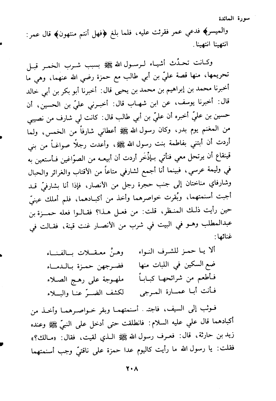 وَكَانَتْ تَحْدُثُ أَشْيَاءُ لِرَسُولِ اللَّهِ - صَلَّى اللهُ عَلَيْهِ وَسَلَّمَ - بِسَبَبِ شُرْبِ الْخَمْرِ قَبْلَ تَحْرِيمِهَا، مِنْهَا قِصَّةُ عَلِيِّ بْنِ أَبِي طَالِبٍ مَعَ حَمْزَةَ رَضِيَ اللَّهُ عَنْهُمَا، وَهِيَ مَا أَخْبَرَنَا مُحَمَّدُ بْنُ إِبْرَاهِيمَ بْنِ مُحَمَّدِ بْنِ يَحْيَى قَالَ: أَخْبَرَنَا أَبُو بَكْرِ بْنُ أَبِي خَالِدٍ قَالَ: أَخْبَرَنَا يُوسُفُ، عَنِ ابْنِ شِهَابٍ قَالَ: أَخْبَرَنِي عَلِيُّ بْنُ الْحُسَيْنِ، أَنَّ حُسَيْنَ بْنَ عَلِيٍّ أَخْبَرَهُ أَنَّ عَلِيَّ بْنَ أَبِي طَالِبٍ قَالَ: كَانَتْ لِي شَارِفٌ مِنْ نَصِيبِي مِنَ الْمَغْنَمِ يَوْمَ بَدْرٍ، وَكَانَ رَسُولُ اللَّهِ - صَلَّى اللهُ عَلَيْهِ وَسَلَّمَ - أَعْطَانِي شَارِفًا مِنَ الْخُمُسِ، وَلَمَّا أَرَدْتُ أَنْ أَبْتَنِيَ بِفَاطِمَةَ بِنْتِ رَسُولِ اللَّهِ - صَلَّى اللهُ عَلَيْهِ وَسَلَّمَ - وَاعَدْتُ رَجُلًا صَوَّاغًا مِنْ بَنِي قَيْنُقَاعَ أَنْ يَرْتَحِلَ مَعِي فَنَأْتِيَ بِإِذْخِرٍ أَرَدْتُ أَنْ أَبِيعَهُ مِنَ الصَّوَّاغِينَ فَأَسْتَعِينَ بِهِ فِي وَلِيمَةِ عُرْسِي، فَبَيْنَمَا