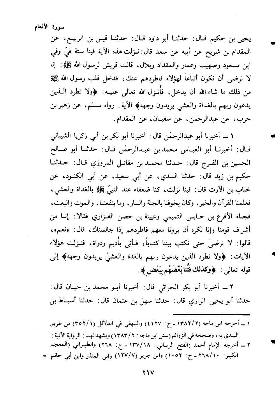 يَحْيَى بْنُ حَكِيمٍ قَالَ: حَدَّثَنَا أَبُو دَاوُدَ قَالَ: حَدَّثَنَا قَيْسُ بْنُ الرَّبِيعِ، عَنِ الْمِقْدَامِ بْنِ شُرَيْحٍ عَنْ أَبِيهِ عَنْ سَعْدٍ قَالَ: نَزَلَتْ هَذِهِ الْآيَةُ فِينَا سِتَّةٍ فِيَّ وَفِي ابْنِ مَسْعُودٍ وَصُهَيْبٍ وَعَمَّارٍ وَالْمِقْدَادِ وَبِلَالٍ، قَالَتْ قُرَيْشٌ لِرَسُولِ اللَّهِ - صَلَّى اللهُ عَلَيْهِ وَسَلَّمَ - إِنَّا لَا نَرْضَى أَنْ نَكُونَ أَتْبَاعًا لِهَؤُلَاءِ فَاطْرُدْهُمْ عَنْكَ، فَدَخَلَ قَلْبَ رَسُولِ اللَّهِ - صَلَّى اللهُ عَلَيْهِ وَسَلَّمَ - مِنْ ذَلِكَ مَا شَاءَ اللَّهُ أَنْ يَدْخُلَ، فَأَنْزَلَ اللَّهُ تَعَالَى عَلَيْهِ: {وَلَا تَطْرُدِ الَّذِينَ يَدْعُونَ رَبَّهُمْ بِالْغَدَاةِ وَالْعَشِيِّ يُرِيدُونَ وَجْهَهُ} الْآيَةَ. رَوَاهُ مُسْلِمٌ، عَنْ زُهَيْرِ بْنِ حَرْبٍ، عَنْ عَبْدِ الرَّحْمَنِ، عَنْ سُفْيَانَ، عَنِ الْمِقْدَامِ.