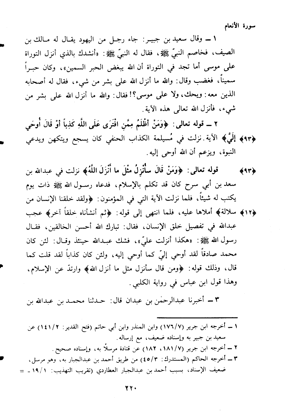 (¬1) - وَقَالَ سَعِيدُ بْنُ جُبَيْرٍ: جَاءَ رَجُلٌ مِنَ الْيَهُودِ يُقَالُ لَهُ مَالِكُ بْنُ الصَّيْفِ، فَخَاصَمَ النَّبِيَّ - صَلَّى اللهُ عَلَيْهِ وَسَلَّمَ - فَقَالَ له النبيّ صلى الله عليه "أَنْشُدُكَ بِالَّذِي أَنْزَلَ التَّوْرَاةَ عَلَى مُوسَى أَمَا تَجِدُ فِي التَّوْرَاةِ أَنَّ اللَّهَ يُبْغِضُ الْحَبْرَ السَّمِينَ؟ "، وَكَانَ حَبْرًا سَمِينًا، فَغَضِبَ وَقَالَ: وَاللَّهِ مَا أَنْزَلَ اللَّهُ عَلَى بَشَرٍ مِنْ شَيْءٍ، فَقَالَ لَهُ أَصْحَابُهُ الَّذِينَ مَعَهُ: وَيْحَكَ، وَلَا عَلَى مُوسَى؟! فَقَالَ: وَاللَّهِ مَا أَنْزَلَ اللَّهُ عَلَى بَشَرٍ مِنْ شَيْءٍ، فَأَنْزَلَ اللَّهُ تَعَالَى هَذِهِ الْآيَةَ. (¬2) - قَوْلُهُ تَعَالَى: {وَمَنْ أَظْلَمُ مِمَّنِ افْتَرَى عَلَى اللَّهِ كَذِبًا أَوْ قَالَ أُوحِيَ إِلَيَّ} الْآيَةَ {93} .