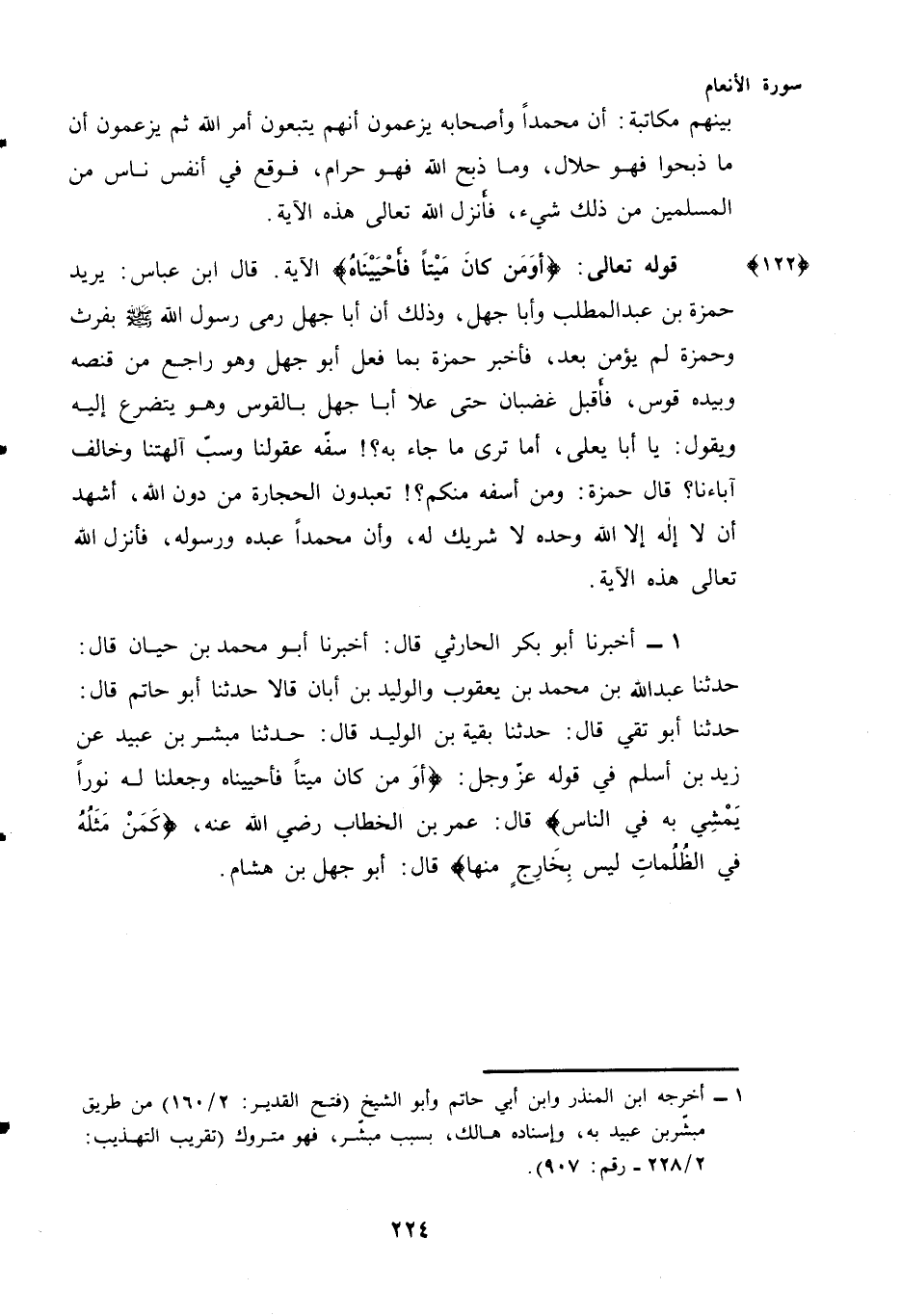 فَأَحْيَيْنَاهُ وَجَعَلْنَا لَهُ نُورًا يَمْشِي بِهِ فِي النَّاسِ} قَالَ: عُمَرُ بْنُ الْخَطَّابِ - رَضِيَ اللَّهُ عَنْهُ - {كَمَنْ مَثَلُهُ فِي الظُّلُمَاتِ لَيْسَ بِخَارِجٍ مِنْهَا} قَالَ: أَبُو جَهْلِ بْنُ هِشَامٍ.