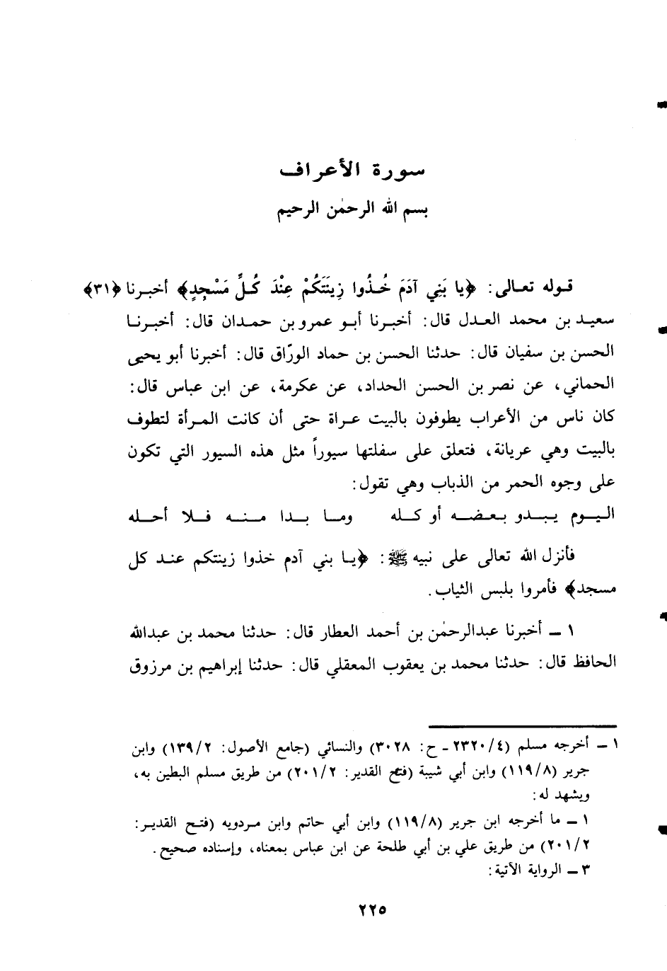 أَخْبَرَنَا سَعِيدُ بْنُ مُحَمَّدٍ الْعَدْلُ قَالَ: أَخْبَرَنَا أَبُو عَمْرِو بْنُ حَمْدَانَ قَالَ: أَخْبَرَنَا الْحَسَنُ بْنُ سُفْيَانَ قَالَ: حَدَّثَنَا الْحَسَنُ بْنُ حَمَّادٍ الْوَرَّاقُ قَالَ: أَخْبَرَنَا أَبُو يَحْيَى الْحِمَّانِيُّ، عَنْ نَصْرِ بْنِ الْحَسَنِ الْحَدَّادِ، عَنْ عِكْرِمَةَ، عَنِ ابْنِ عَبَّاسٍ قَالَ: كَانَ نَاسٌ مِنَ الْأَعْرَابِ يَطُوفُونَ بِالْبَيْتِ عُرَاةً حَتَّى أَنْ كَانَتِ الْمَرْأَةُ لَتَطُوفُ بِالْبَيْتِ وَهِيَ عُرْيَانَةٌ، فَتُعَلِّقُ عَلَى سُفْلَتِهَا سُيُورًا مِثْلَ هَذِهِ السُّيُورِ الَّتِي تَكُونُ عَلَى وُجُوهِ الْحُمُرِ مِنَ الذُّبَابِ وَهِيَ تَقُولُ: