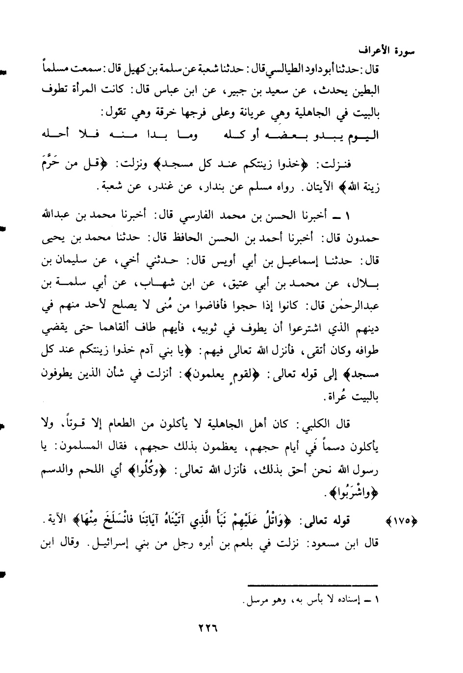 (¬1) - أَخْبَرَنَا الْحَسَنُ بْنُ مُحَمَّدٍ الْفَارِسِيُّ قَالَ: أَخْبَرَنَا مُحَمَّدُ بْنُ عَبْدِ اللَّهِ حَمْدُونَ قَالَ: أَخْبَرَنَا أَحْمَدُ بْنُ الْحَسَنِ الْحَافِظُ قَالَ: حَدَّثَنَا مُحَمَّدُ بْنُ يَحْيَى قَالَ: حَدَّثَنَا إِسْمَاعِيلُ بْنُ أَبِي أُوَيْسٍ قَالَ: حَدَّثَنِي أَخِي، عَنْ سُلَيْمَانَ بْنِ بِلَالٍ، عَنْ مُحَمَّدِ بْنِ أَبِي عَتِيقٍ، عَنِ ابْنِ شِهَابٍ، عَنْ أَبِي سَلَمَةَ بْنِ عَبْدِ الرَّحْمَنِ قَالَ: كَانُوا إِذَا حَجُّوا فَأَفَاضُوا مِنْ مِنًى لَا يَصْلُحُ لِأَحَدٍ مِنْهُمْ فِي دِينِهِمُ الَّذِي اشْتَرَعُوا أَنْ يَطُوفَ فِي ثَوْبَيْهِ، فَأَيُّهُمْ طَافَ أَلْقَاهُمَا حَتَّى يَقْضِيَ طَوَافَهُ وَكَانَ أَتْقَى، فَأَنْزَلَ اللَّهُ تعالى فيهم: {يَا بَنِي آدَمَ خُذُوا زِينَتَكُمْ عِنْدَ كُلِّ مَسْجِدٍ} إِلَى قَوْلِهِ تَعَالَى: {لِقَوْمٍ يَعْلَمُونَ} أُنْزِلَتْ فِي شَأْنِ الَّذِينَ يَطُوفُونَ بِالْبَيْتِ عُرَاةً.