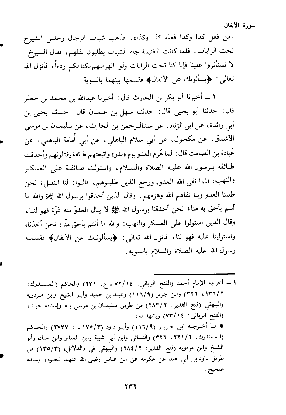 (¬1) - أَخْبَرَنَا أَبُو بَكْرِ بْنُ الْحَارِثِ قَالَ: أَخْبَرَنَا عَبْدُ اللَّهِ بْنُ مُحَمَّدِ بْنِ جَعْفَرٍ قَالَ: حَدَّثَنَا أَبُو يَحْيَى قَالَ: حَدَّثَنَا سَهْلُ بْنُ عُثْمَانَ قَالَ: حَدَّثَنَا يَحْيَى بْنُ أَبِي زَائِدَةَ، عَنِ ابْنِ الزِّنَادِ، عَنْ عَبْدِ الرَّحْمَنِ بْنِ الْحَارِثِ، عَنْ سُلَيْمَانَ بْنِ مُوسَى الْأَشْدَقِ، عَنْ مَكْحُولٍ، عَنْ أَبِي سَلَّامٍ الْبَاهِلِيِّ، عَنْ أَبِي أُمَامَةَ الْبَاهِلِيِّ، عَنْ عُبَادَةَ بْنِ الصَّامِتِ قَالَ: لَمَّا هُزِمَ الْعَدُوُّ يَوْمَ "بَدْرٍ" وَاتَّبَعَتْهُمْ طَائِفَةٌ يَقْتُلُونَهُمْ وَأَحْدَقَتْ طَائِفَةٌ بِرَسُولِ اللَّهِ عَلَيْهِ الصَّلَاةُ وَالسَّلَامُ، وَاسْتَوْلَتْ طَائِفَةٌ عَلَى الْعَسْكَرِ وَالنَّهْبِ، فَلَمَّا نَفَى اللَّهُ الْعَدُوَّ، وَرَجَعَ الَّذِينَ طَلَبُوهُمْ، قَالُوا: لَنَا النَّفَلُ؛ نَحْنُ طَلَبْنَا الْعَدُوَّ وَبِنَا نَفَاهُمُ اللَّهُ وَهَزَمَهُمْ، وَقَالَ الَّذِينَ أَحْدَقُوا بِرَسُولِ اللَّهِ - صَلَّى اللهُ عَلَيْهِ وَسَلَّمَ - وَاللَّهِ مَا أَنْتُمْ بِأَحَقَّ بِهِ مِنَّا؛ نَحْنُ أَحْدَقْنَا بِرَسُولِ اللَّهِ - صَلَّى اللهُ عَلَيْهِ وَسَلَّمَ - لَا يَنَالُ الْعَدُوُّ مِنْهُ غِرَّةً فَهُوَ لَنَا، وَقَالَ الَّذِينَ اسْتَوْلَوْا عَلَى الْعَسْكَرِ وَالنَّهْبِ: وَاللَّهِ مَا أَنْتُمْ بِأَحَقَّ مِنَّا؛ نَحْنُ أَخَذْنَاهُ وَاسْتَوْلَيْنَا عَلَيْهِ فَهُوَ لَنَا، فَأَنْزَلَ اللَّهُ تَعَالَى: {يَسْأَلُونَكَ عَنِ الْأَنْفَالِ} فَقَسَمَهُ رَسُولُ اللَّهِ عَلَيْهِ الصَّلَاةُ وَالسَّلَامُ بِالسَّوِيَّةِ.