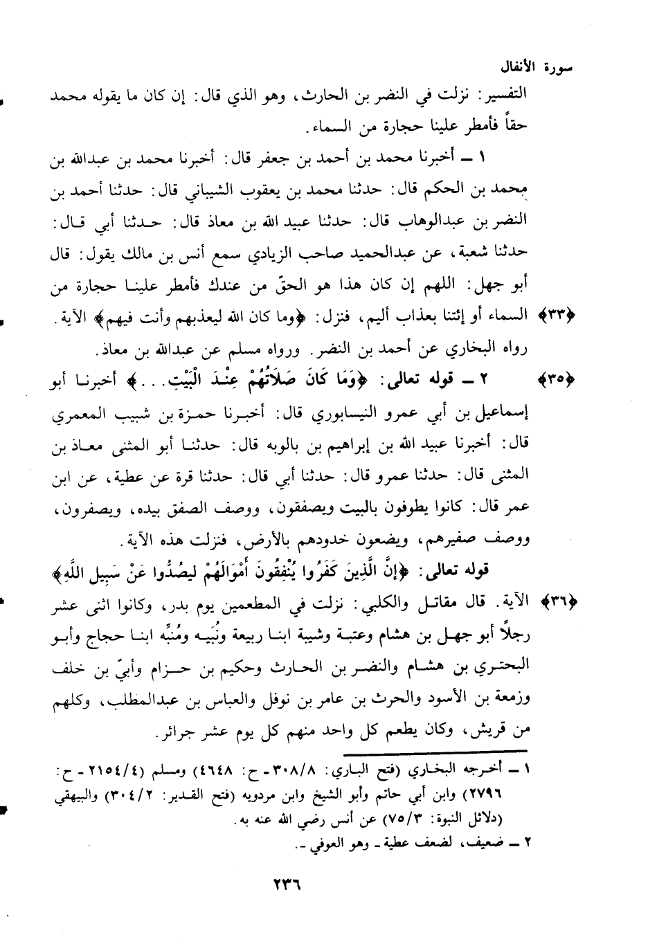 (¬1) - أَخْبَرَنَا مُحَمَّدُ بْنُ أَحْمَدَ بْنِ جَعْفَرٍ قَالَ: أَخْبَرَنَا مُحَمَّدُ بْنُ عَبْدِ اللَّهِ بْنِ مُحَمَّدِ بْنِ الْحَكَمِ قَالَ: حَدَّثَنَا مُحَمَّدُ بْنُ يَعْقُوبَ الشَّيْبَانِيُّ قَالَ: حَدَّثَنَا أَحْمَدُ بْنُ النَّضْرِ بْنِ عَبْدِ الْوَهَّابِ قَالَ: حَدَّثَنَا عُبَيْدُ اللَّهِ بْنُ مُعَاذٍ قَالَ: حَدَّثَنَا أَبِي قَالَ: حَدَّثَنَا شُعْبَةُ، عَنْ عَبْدِ الْحَمِيدِ صَاحِبِ الزِّيَادِيِّ سَمِعَ أَنَسَ بْنَ مَالِكٍ يَقُولُ: قَالَ أَبُو جَهْلٍ: اللَّهُمَّ إِنْ كَانَ هَذَا هُوَ الْحَقَّ مِنْ عِنْدِكَ فَأَمْطِرْ عَلَيْنَا حِجَارَةً مِنَ السَّمَاءِ أَوِ ائْتِنَا بِعَذَابٍ أَلِيمٍ، فَنَزَلَ: