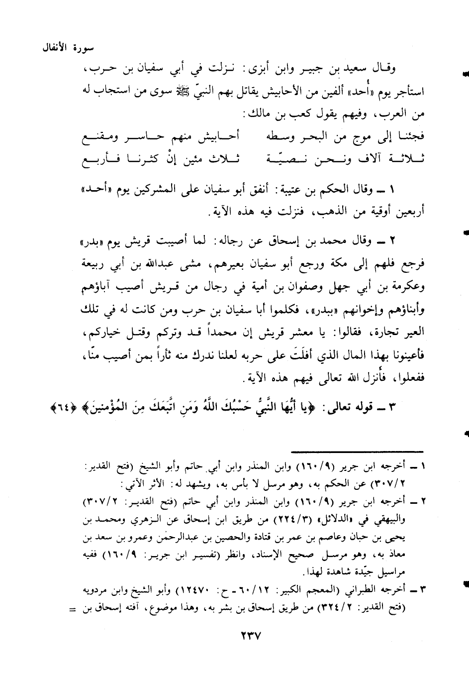 1 - قول الحافظ ابن كثير "وفي هذا نظر؛ لأن الآية مدنية، وإسلام عمر كان بمكة بعد الهجرة إلى أرض الحبشة، وقبل الهجرة إلى المدينة" (تفسير ابن كثير: 2/324) .