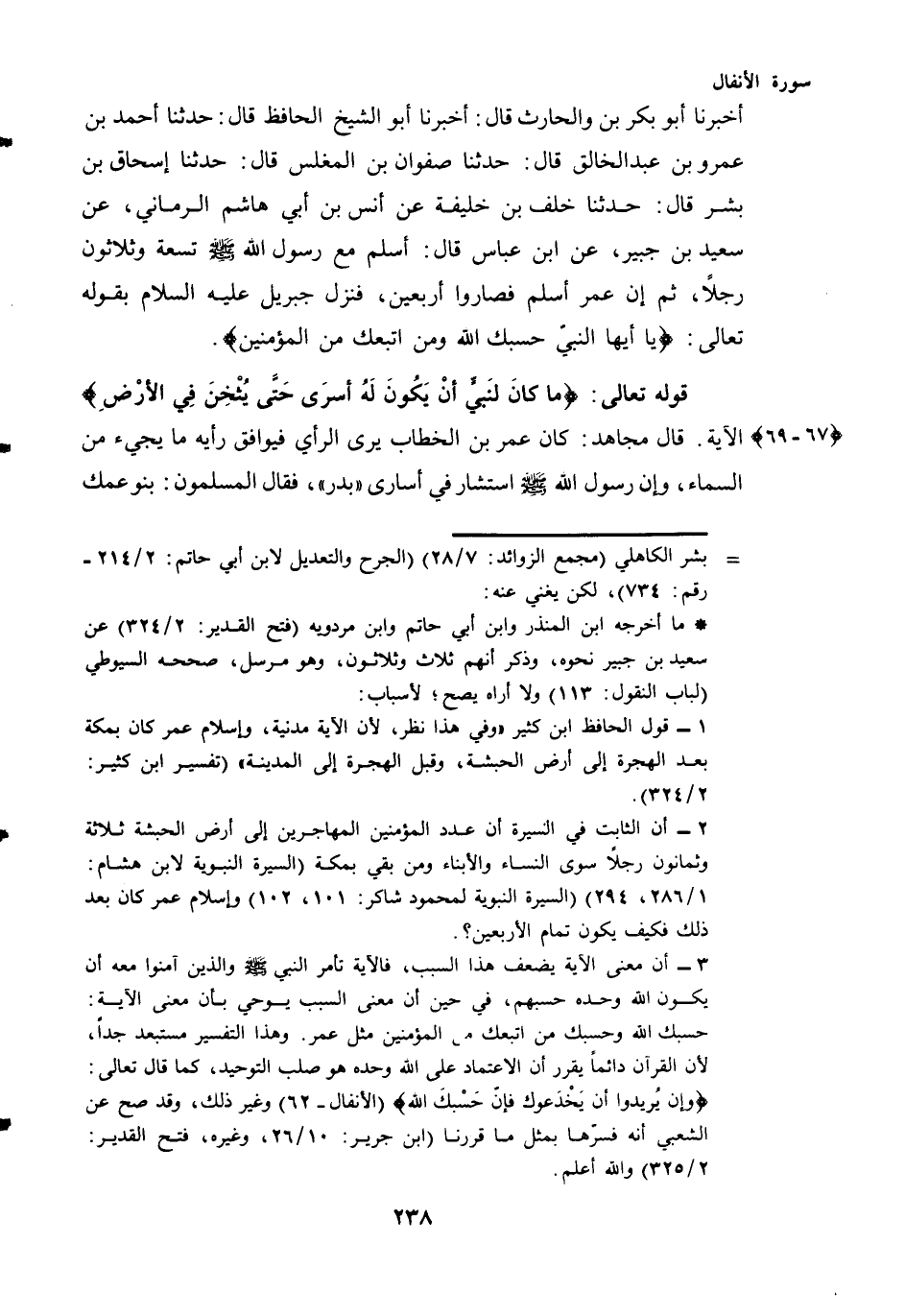أَخْبَرَنَا أَبُو بَكْرِ بْنُ والحارث قَالَ: أَخْبَرَنَا أَبُو الشَّيْخِ الْحَافِظُ قَالَ: حَدَّثَنَا أَحْمَدُ بْنُ عَمْرِو بْنِ عَبْدِ الْخَالِقِ قَالَ: حَدَّثَنَا صَفْوَانُ بْنُ الْمُغَلِّسِ قَالَ: حَدَّثَنَا إِسْحَاقُ بْنُ بِشْرٍ قَالَ: حَدَّثَنَا خَلَفُ بْنُ خَلِيفَةَ عَنْ أَنَسِ بْنِ أَبِي هَاشِمٍ الرُّمَّانِيِّ، عَنْ سَعِيدِ بْنِ جُبَيْرٍ، عَنِ ابْنِ عَبَّاسٍ قَالَ: أَسْلَمَ مَعَ رَسُولِ اللَّهِ - صَلَّى اللهُ عَلَيْهِ وَسَلَّمَ - تِسْعَةٌ وَثَلَاثُونَ رَجُلًا، ثُمَّ إِنَّ عُمَرَ أَسْلَمَ فَصَارُوا أَرْبَعِينَ، فَنَزَلَ جِبْرِيلُ عَلَيْهِ السَّلَامُ بِقَوْلِهِ تَعَالَى: {يَا أَيُّهَا النَّبِيُّ حَسْبُكَ اللَّهُ وَمَنِ اتَّبَعَكَ مِنَ الْمُؤْمِنِينَ}
