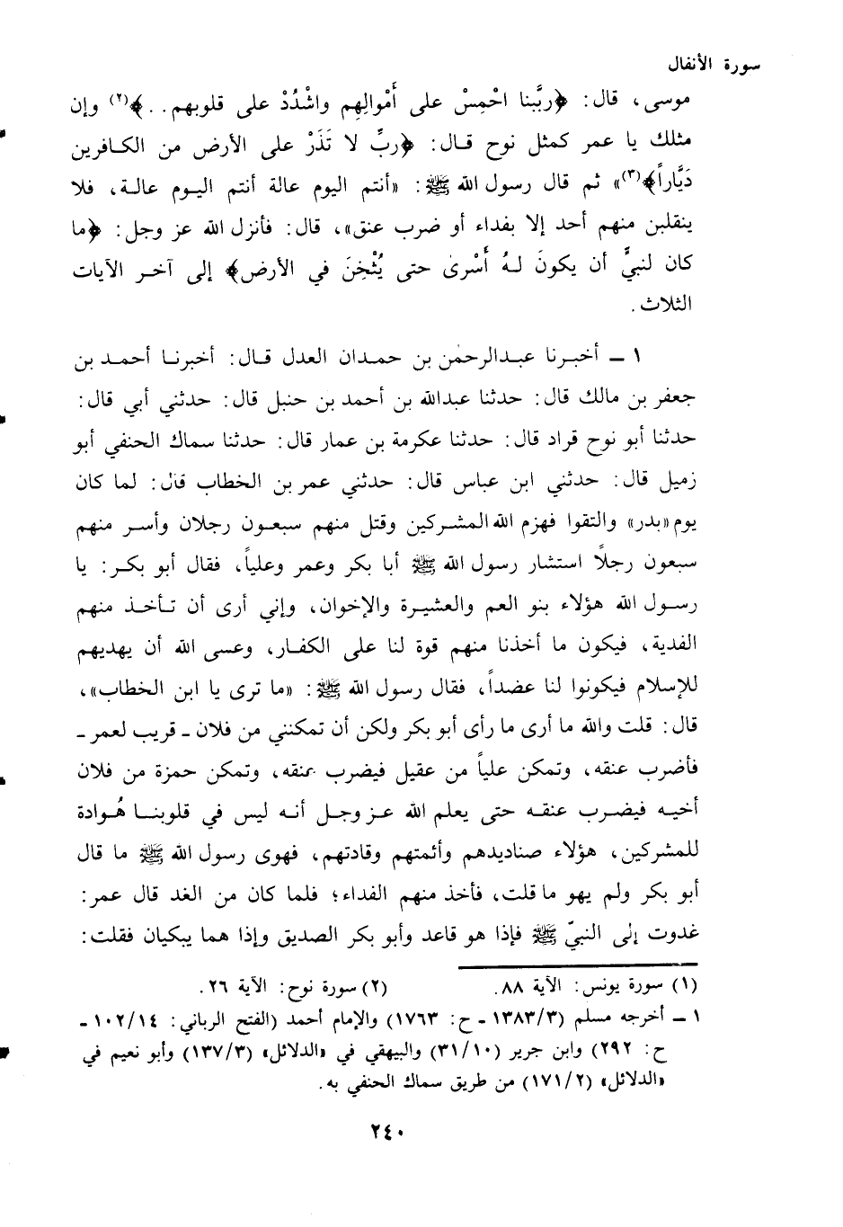 (¬3) - أَخْبَرَنَا عَبْدُ الرَّحْمَنِ بْنُ حَمْدَانَ الْعَدْلُ قَالَ: أَخْبَرَنَا أَحْمَدُ بْنُ جَعْفَرِ بْنِ مَالِكٍ قَالَ: حَدَّثَنَا عَبْدُ اللَّهِ بْنُ أَحْمَدَ بْنِ حَنْبَلٍ قَالَ: حَدَّثَنِي أَبِي قَالَ: حَدَّثَنَا أَبُو نُوحٍ قُرَادٌ قَالَ: حَدَّثَنَا عِكْرِمَةُ بْنُ عَمَّارٍ قَالَ: حَدَّثَنَا سِمَاكٌ الْحَنَفِيُّ أَبُو زُمَيْلٍ قَالَ: حَدَّثَنِي ابْنُ عَبَّاسٍ قَالَ: حَدَّثَنِي عُمَرُ بْنُ الْخَطَّابِ قَالَ: لَمَّا كَانَ يَوْمُ "بَدْرٍ" وَالْتَقَوْا فَهَزَمَ اللَّهُ الْمُشْرِكِينَ وَقُتِلَ مِنْهُمْ سَبْعُونَ رَجُلًا وَأُسِرَ مِنْهُمْ سَبْعُونَ رَجُلًا اسْتَشَارَ رَسُولُ اللَّهِ - صَلَّى اللهُ عَلَيْهِ وَسَلَّمَ - أَبَا بَكْرٍ وَعُمَرَ وَعَلِيًّا، فَقَالَ أَبُو بَكْرٍ: يَا رَسُولَ اللَّهِ هَؤُلَاءِ بَنُو الْعَمِّ وَالْعَشِيرَةُ وَالْإِخْوَانُ، وَإِنِّي أَرَى أَنْ تَأْخُذَ مِنْهُمُ الْفِدْيَةَ، فَيَكُونَ مَا أَخَذْنَا مِنْهُمْ قُوَّةً لَنَا عَلَى الْكُفَّارِ، وَعَسَى اللَّهُ أَنْ يَهْدِيَهُمْ لِلْإِسْلَامِ فَيَكُونُوا لَنَا عَضُدًا، فَقَالَ رَسُولُ اللَّهِ - صَلَّى اللهُ عَلَيْهِ وَسَلَّمَ - "مَا تَرَى يَا ابْنَ الْخَطَّابِ"، قَالَ: قُلْتُ وَاللَّهِ مَا أَرَى مَا رَأَى أَبُو بَكْرٍ وَلَكِنْ أَنْ تُمَكِّنَنِي مِنْ فُلَانٍ - قَرِيبٍ لِعُمَرَ - فَأَضْرِبَ عُنُقَهُ، وَتُمَكِّنَ عَلِيًّا مِنْ عَقِيلٍ فَيَضْرِبَ عُنُقَهُ، وَتُمَكِّنَ حَمْزَةَ مِنْ فُلَانٍ أَخِيهِ فَيَضْرِبَ عُنُقَهُ حَتَّى يَعْلَمَ اللَّهُ - عَزَّ وَجَلَّ - أَنَّهُ لَيْسَ فِي قُلُوبِنَا هَوَادَةٌ لِلْمُشْرِكِينَ، هَؤُلَاءِ صَنَادِيدُهُمْ وَأَئِمَّتُهُمْ وَقَادَتُهُمْ، فَهَوِيَ رَسُولُ اللَّهِ - صَلَّى اللهُ عَلَيْهِ وَسَلَّمَ - مَا قَالَ أَبُو بَكْرٍ وَلَمْ يَهْوَ مَا قُلْتُ، فَأَخَذَ مِنْهُمُ الْفِدَاءَ؛ فَلَمَّا كَانَ مِنَ الْغَدِ قَالَ عُمَرُ: غَدَوْتُ إِلَى النَّبِيِّ - صَلَّى اللهُ عَلَيْهِ وَسَلَّمَ - فَإِذَا هُوَ قَاعِدٌ وَأَبُو بَكْرٍ الصِّدِّيقُ وَإِذَا هُمَا يَبْكِيَانِ فَقُلْتُ: