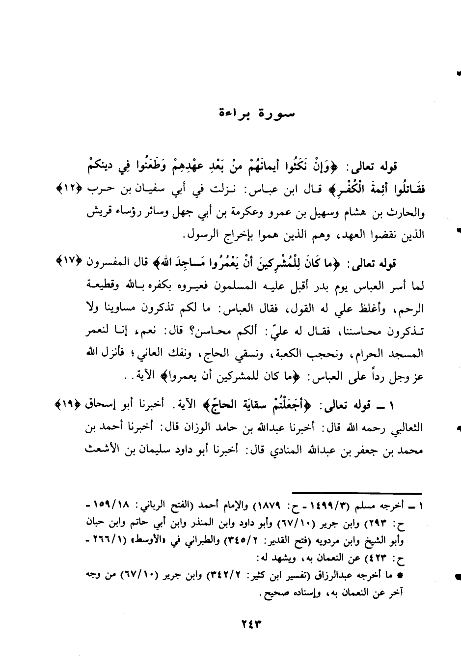 قَالَ الْمُفَسِّرُونَ لَمَّا أُسِرَ الْعَبَّاسُ يَوْمَ بَدْرٍ أَقْبَلَ عَلَيْهِ الْمُسْلِمُونَ فَعَيَّرُوهُ بِكُفْرِهِ بِاللَّهِ وَقَطِيعَةِ الرَّحِمِ، وَأَغْلَظَ عَلِيٌّ لَهُ الْقَوْلَ، فَقَالَ الْعَبَّاسُ: مَا لَكُمْ تَذْكُرُونَ مَسَاوِينَا وَلَا تَذْكُرُونَ، مَحَاسِنَنَا، فَقَالَ لَهُ عَلِيٌّ: أَلَكُمُ مَحَاسِنُ؟ قَالَ: نَعَمْ، إِنَّا لَنَعْمُرُ الْمَسْجِدَ الْحَرَامِ، وَنَحْجُبُ الْكَعْبَةَ، وَنَسَقِي الْحَاجَّ، وَنَفُكُّ الْعَانِيَ؛ فَأَنْزَلَ اللَّهُ - عَزَّ وَجَلَّ - رَدًّا عَلَى الْعَبَّاسِ: {مَا كَانَ لِلْمُشْرِكِينَ أَنْ يَعْمُرُوا} الْآيَةَ.