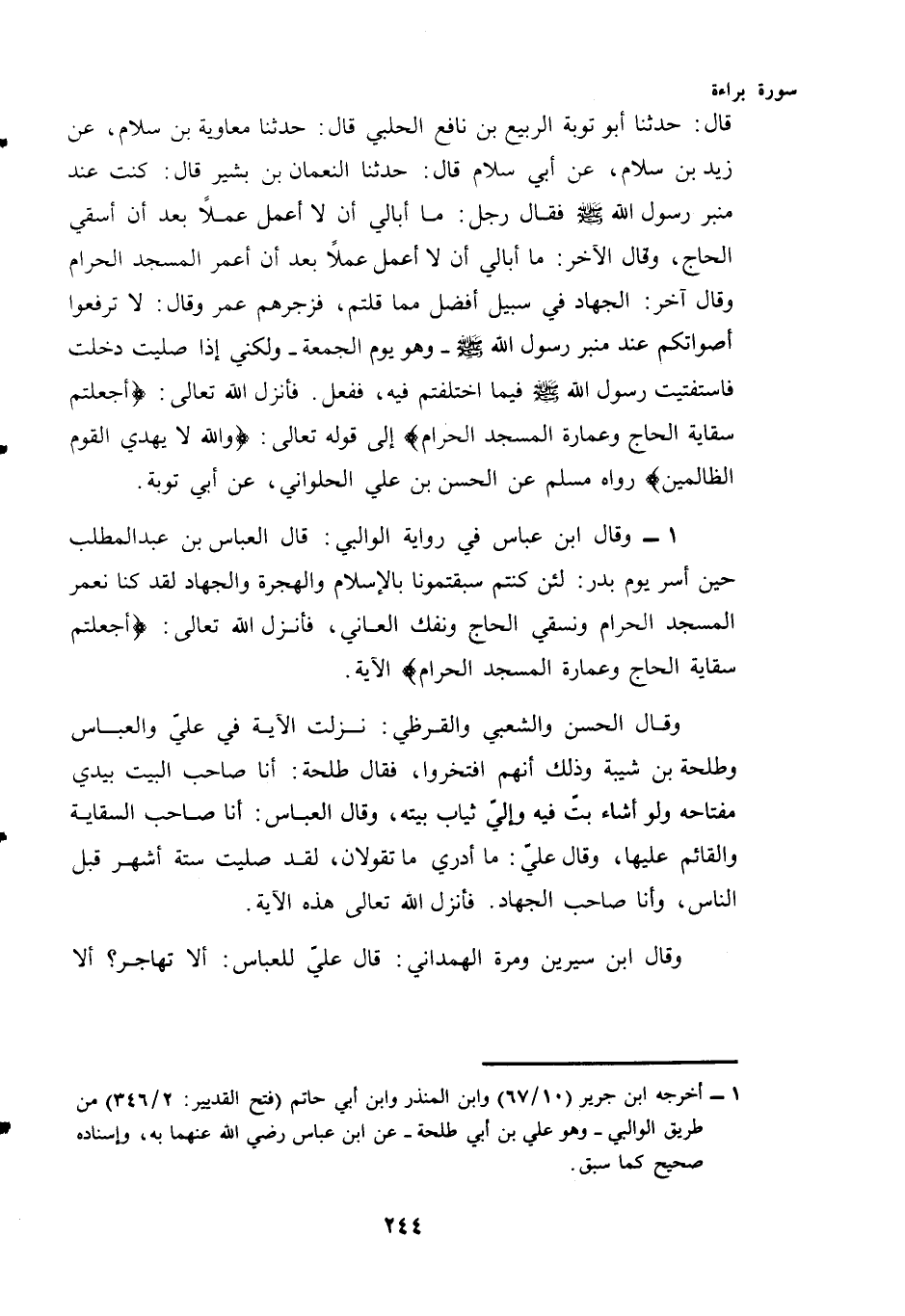 (¬1) - وَقَالَ ابْنُ عَبَّاسٍ فِي رِوَايَةِ الْوَالِبِيِّ: قَالَ الْعَبَّاسُ بْنُ عَبْدِ الْمُطَّلِبِ حِينَ أُسِرَ يَوْمَ بَدْرٍ: لَئِنْ كُنْتُمْ سَبَقْتُمُونَا بِالْإِسْلَامِ وَالْهِجْرَةِ وَالْجِهَادِ لَقَدْ كُنَّا نَعْمُرُ الْمَسْجِدَ الْحَرَامَ وَنَسَقِي الْحَاجَّ وَنَفُكُّ الْعَانِيَ، فَأَنْزَلَ اللَّهُ تَعَالَى: {أَجَعَلْتُمْ سِقَايَةَ الْحَاجِّ وَعِمَارَةَ الْمَسْجِدِ الْحَرَامِ} الْآيَةَ.
