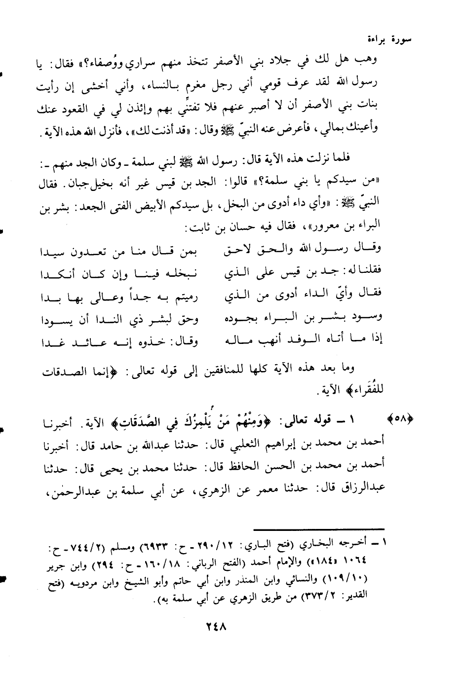 وَهْبٍ هَلْ لَكَ فِي جِلَادِ بَنِي الْأَصْفَرِ تَتَّخِذُ مِنْهُمْ سَرَارِيَّ وَوُصَفَاءَ؟ " فَقَالَ: يَا رَسُولَ اللَّهِ لَقَدْ عَرَفَ قَوْمِي أَنِّي رَجُلٌ مُغْرَمٌ بِالنِّسَاءِ، وَإِنِّي أَخْشَى إِنْ رَأَيْتُ بَنَاتِ بَنِي الْأَصْفَرِ أَنْ لا أصبر عنهم فَلَا تَفْتِنِّي بِهِمْ وَائْذَنْ لِي فِي الْقُعُودِ عَنْكَ وَأُعِينُكَ بِمَالِي، فَأَعْرَضَ عَنْهُ النَّبِيُّ - صَلَّى اللهُ عَلَيْهِ وَسَلَّمَ - وَقَالَ: "قَدْ أَذِنْتُ لَكَ"، فَأَنْزَلَ اللَّهُ هَذِهِ الْآيَةَ. فَلَمَّا نَزَلَتْ هَذِهِ الْآيَةُ قَالَ: رَسُولُ اللَّهِ - صَلَّى اللهُ عَلَيْهِ وَسَلَّمَ - لَبَنِي سَلِمَةَ - وَكَانَ الْجَدُّ مِنْهُمْ -: "مَنْ سَيِّدُكُمْ يَا بَنِي سَلِمَةَ؟ " قَالُوا: الْجَدُّ بْنُ قَيْسٍ غَيْرَ أَنَّهُ بَخِيلٌ جَبَانٌ. فَقَالَ النَّبِيُّ - صَلَّى اللهُ عَلَيْهِ وَسَلَّمَ - "وَأَيُّ دَاءٍ أَدْوَى مِنَ الْبُخْلِ، بَلْ سَيِّدُكُمُ الْأَبْيَضُ الْفَتَى الْجَعْدُ: بِشْرُ بْنُ الْبَرَاءِ بْنِ مَعْرُورٍ"، فَقَالَ فِيهِ حَسَّانُ بْنُ ثَابِتٍ: