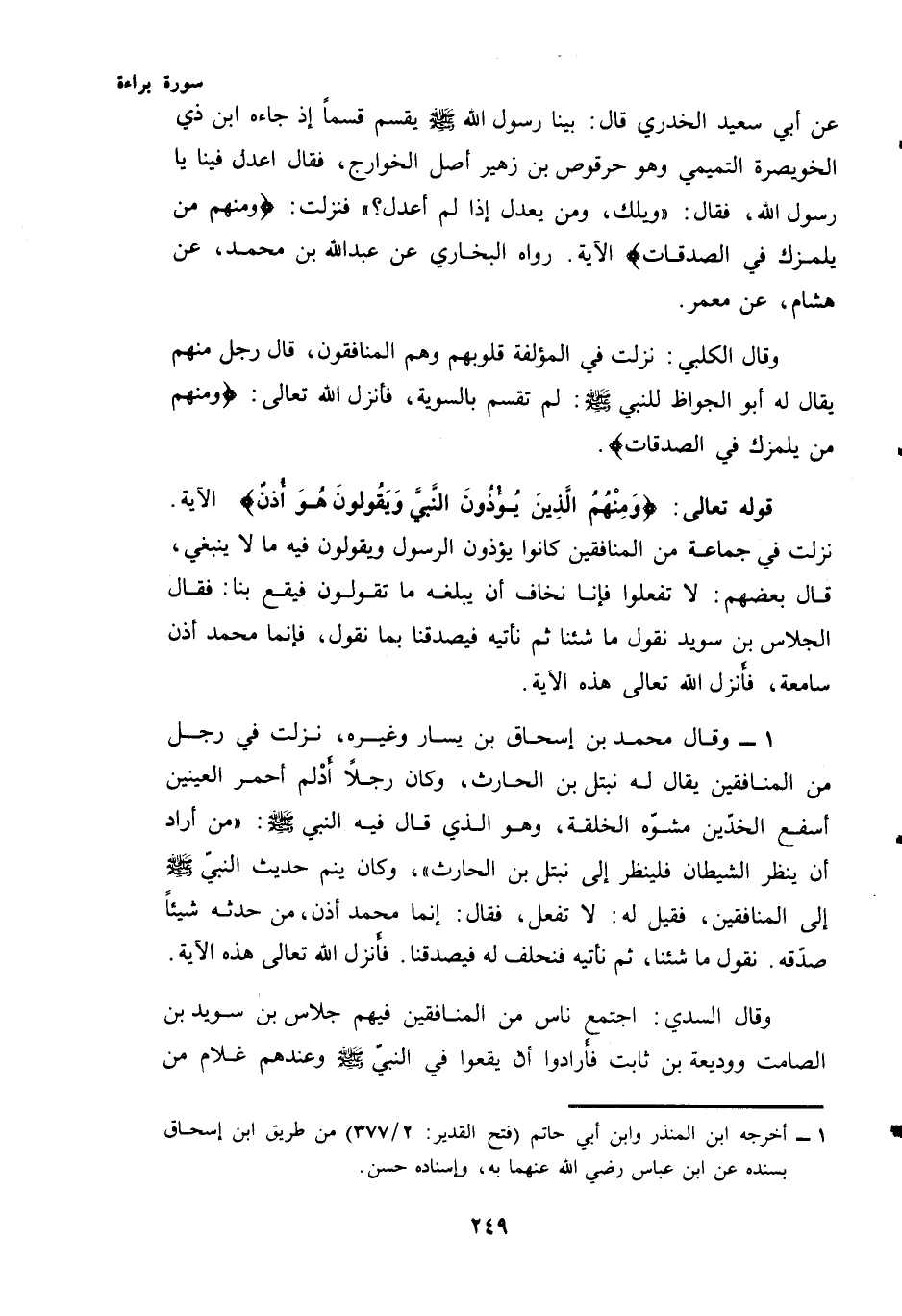 عَنْ أَبِي سَعِيدٍ الْخُدْرِيِّ قَالَ: بَيْنَا رَسُولُ اللَّهِ - صَلَّى اللهُ عَلَيْهِ وَسَلَّمَ - يَقْسِمُ قَسْمًا إِذْ جَاءَهُ ابْنُ ذِي الْخُوَيْصِرَةِ التَّمِيمِيُّ وَهُوَ حَرْقُوصُ بْنُ زُهَيْرٍ أَصْلُ الْخَوَارِجِ، فَقَالَ اعْدِلْ فِينَا يَا رَسُولَ اللَّهِ، فَقَالَ: "وَيْلَكَ، وَمَنْ يَعْدِلُ إِذَا لَمْ أَعْدِلْ؟ " فَنَزَلَتْ: {وَمِنْهُمْ مَنْ يَلْمِزُكَ فِي الصَّدَقَاتِ} الْآيَةَ. رَوَاهُ الْبُخَارِيُّ عَنْ عَبْدِ اللَّهِ بْنِ مُحَمَّدٍ، عَنْ هِشَامٍ، عَنْ مَعْمَرٍ.