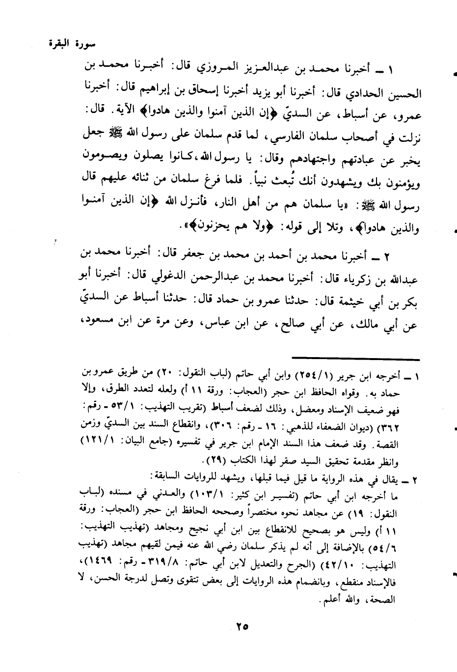 (¬2) - يقال في هذه الرواية ما قيل فيما قبلها، ويشهد للروايات السابقة: ما أخرجه ابن أبي حاتم (تفسير ابن كثير: 1/103) والعدني في مسنده (لباب النقول: 19) عن مجاهد نحوه مختصرا وصححه الحافظ ابن حجر (العجاب: ورقة 11 أ) وليس هو بصحيح للانقطاع بين ابن أبي نجيح ومجاهد (تهذيب التهذيب: 6/54) بالإضافة إلى أنه لم يذكر سلمان رضي الله عنه فيمن لقيهم مجاهد (تهذيب التهذيب: 10/42) (الجرح والتعديل لابن أبي حاتم: 8/319 - رقم: 1469) ، فالإسناد منقطع، وبانضمام هذه الروايات إلى بعض تتقوى وتصل لدرجة الحسن، لا الصحة، والله أعلم.