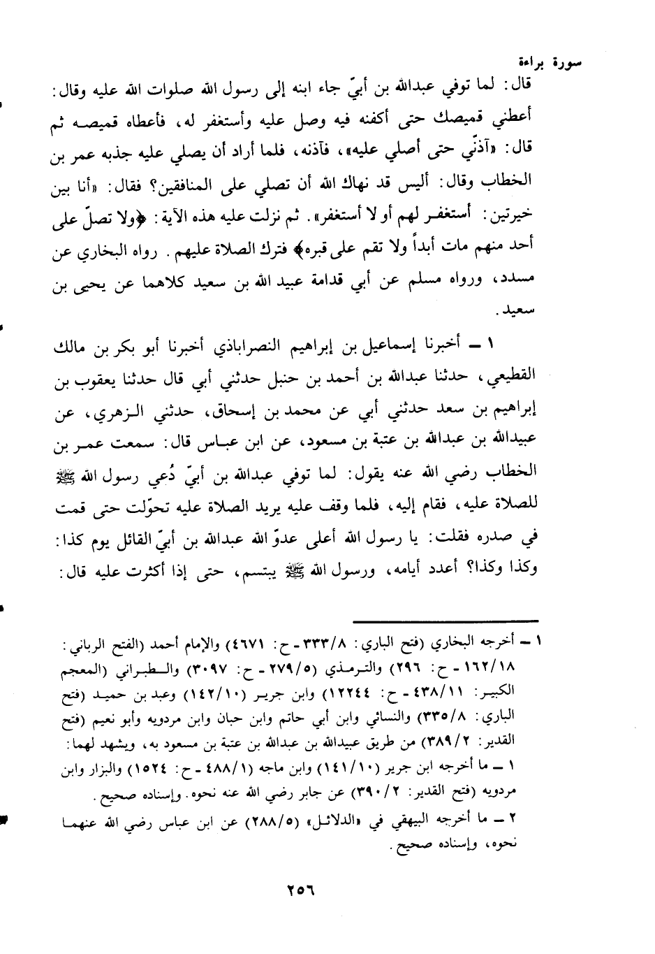 قَالَ: لَمَّا تُوُفِّيَ عَبْدُ اللَّهِ بْنُ أُبَيٍّ جَاءَ ابْنُهُ إِلَى رَسُولِ اللَّهِ صَلَوَاتُ اللَّهِ عَلَيْهِ وَقَالَ: أَعْطِنِي قَمِيصَكَ حَتَّى أُكَفِّنَهُ فِيهِ وأصلي عَلَيْهِ وَاسْتَغْفِرْ لَهُ، فَأَعْطَاهُ قَمِيصَهُ ثُمَّ قَالَ: "آذِنِّي حَتَّى أُصَلِّيَ عَلَيْهِ"، فَآذَنَهُ، فَلَمَّا أَرَادَ أَنْ يُصَلِّيَ عَلَيْهِ جَذَبَهُ عُمَرُ بْنُ الْخَطَّابِ وَقَالَ: أَلَيْسَ قَدْ نَهَاكَ اللَّهُ أَنْ تُصَلِّيَ عَلَى الْمُنَافِقِينَ؟ فَقَالَ: "أَنَا بَيْنَ خِيرَتَيْنِ: أَسْتَغْفِرُ لَهُمْ أَوْ لَا أَسْتَغْفِرُ". ثُمَّ نَزَلَتْ عَلَيْهِ هَذِهِ الْآيَةُ: {وَلَا تُصَلِّ عَلَى أَحَدٍ مِنْهُمْ مَاتَ أَبَدًا وَلَا تَقُمْ عَلَى قَبْرِهِ} فَتَرَكَ الصَّلَاةَ عَلَيْهِمْ. رَوَاهُ الْبُخَارِيُّ عَنْ مُسَدَّدٍ، وَرَوَاهُ مُسْلِمٌ عَنْ أَبِي قُدَامَةَ عُبَيْدِ اللَّهِ بْنِ سَعِيدٍ كِلَاهُمَا عَنْ يَحْيَى بْنِ سَعِيدٍ.