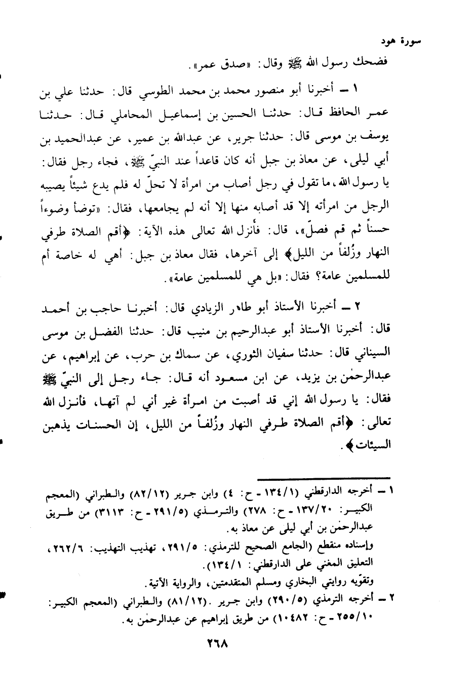 (¬2) - أَخْبَرَنَا الْأُسْتَاذُ أَبُو طَاهِرٍ الزِّيَادِيُّ قَالَ: أَخْبَرَنَا حَاجِبُ بْنُ أَحْمَدَ قَالَ: أَخْبَرَنَا الْأُسْتَاذُ أَبُو عَبْدِ الرَّحِيمِ بْنُ مُنِيبٍ قَالَ: حَدَّثَنَا الْفَضْلُ بْنُ مُوسَى السِّينَانِيُّ قَالَ: حَدَّثَنَا سُفْيَانُ الثَّوْرِيُّ، عَنْ سِمَاكِ بْنِ حَرْبٍ، عَنْ إِبْرَاهِيمَ، عَنْ عَبْدِ الرَّحْمَنِ بْنِ يَزِيدَ، عَنِ ابْنِ مَسْعُودٍ أَنَّهُ قَالَ: جَاءَ رَجُلٌ إِلَى النَّبِيِّ - صَلَّى اللهُ عَلَيْهِ وَسَلَّمَ - فَقَالَ: يَا رَسُولَ اللَّهِ إِنِّي قَدْ أَصَبْتُ مِنِ امْرَأَةٍ غَيْرَ أَنِّي لَمْ آتِهَا، فَأَنْزَلَ اللَّهُ تَعَالَى: {وَأَقِمِ الصَّلَاةَ طَرَفَيِ النَّهَارِ وَزُلَفًا مِنَ اللَّيْلِ إِنَّ الْحَسَنَاتِ يُذْهِبْنَ السَّيِّئَاتِ} .