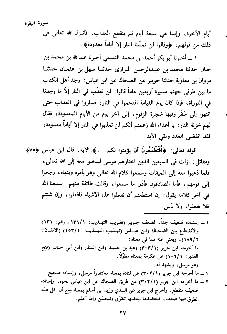 (¬1) - أَخْبَرَنَا أَبُو بَكْرٍ أَحْمَدُ بْنُ مُحَمَّدٍ التَّمِيمِيُّ أَخْبَرَنَا عَبْدُ اللَّهِ بْنُ مُحَمَّدِ بْنِ حَيَّانَ حَدَّثَنَا مُحَمَّدُ بْنُ عَبْدِ الرَّحْمَنِ الرَّازِيُّ حَدَّثَنَا سَهْلُ بْنُ عُثْمَانَ حَدَّثَنَا مَرْوَانُ بْنُ مُعَاوِيَةَ حَدَّثَنَا جُوَيْبِرٌ عَنِ الضَّحَّاكِ عَنِ ابْنِ عَبَّاسٍ: فِي قَوْلِهِ: " وَقَالُوا لَنْ تَمَسَّنَا النَّارُ إِلَّا أَيَّامًا مَعْدُودَةً " قَالَ وَجَدَ أَهْلُ الْكِتَابِ مَا بَيْنَ طَرَفَيْ جَهَنَّمَ مَسِيرَةَ أربعين عامًا قالوا: لَنْ نُعَذَّبَ فِي النَّارِ إِلَّا مَا وَجَدْنَا فِي التَّوْرَاةِ، فَإِذَا كَانَ يَوْمُ الْقِيَامَةِ اقْتَحَمُوا فِي النَّارِ، فَسَارُوا فِي الْعَذَابِ حَتَّى انْتَهَوْا إِلَى سَقَرَ وَفِيهَا شَجَرَةُ الزَّقُّومِ، إِلَى آخِرِ يَوْمٍ مِنَ الْأَيَّامِ الْمَعْدُودَةِ، فَقَالَ لَهُمْ خَزَنَةُ النَّارِ: يَا أَعْدَاءَ اللَّهِ زَعَمْتُمْ أَنَّكُمْ لَنْ تُعَذَّبُوا فِي النَّارِ إِلَّا أَيَّامًا مَعْدُودَةً، فَقَدِ انْقَضَى الْعَدَدُ وَبَقِيَ الْأَبَدُ.