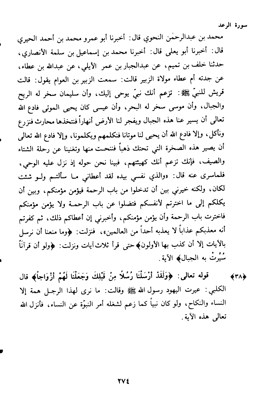 مُحَمَّدُ بْنُ عَبْدِ الرَّحْمَنِ النَّحْوِيُّ قَالَ: أَخْبَرَنَا أَبُو عَمْرٍو مُحَمَّدُ بْنُ أَحْمَدَ الْحِيرِيُّ قَالَ: أَخْبَرَنَا أَبُو يَعْلَى قَالَ: أَخْبَرَنَا مُحَمَّدُ بْنُ إِسْمَاعِيلَ بْنِ سَلَمَةَ الْأَنْصَارِيُّ، حَدَّثَنَا خَلَفُ بْنُ تَمِيمٍ، عَنْ عَبْدِ الْجَبَّارِ بْنِ عُمَرَ الْأَيْلِيِّ، عَنْ عَبْدِ اللَّهِ بْنِ عَطَاءٍ، عَنْ جَدَّتِهِ أُمِّ عَطَاءٍ مَوْلَاةِ الزُّبَيْرِ قَالَتْ: سَمِعْتُ الزُّبَيْرَ بْنَ الْعَوَّامِ يَقُولُ: قَالَتْ قُرَيْشٌ لِلنَّبِيِّ - صَلَّى اللهُ عَلَيْهِ وَسَلَّمَ - تَزْعُمُ أَنَّكَ نَبِيٌّ يُوحَى إِلَيْكَ، وَأَنَّ سُلَيْمَانَ سخر لَهُ الرِّيحُ وَالْجِبَالُ، وَأَنَّ مُوسَى سُخِّرَ لَهُ الْبَحْرُ، وَأَنَّ عِيسَى كَانَ يُحْيِي الْمَوْتَى فَادْعُ اللَّهَ تَعَالَى أَنْ يُسَيِّرَ عَنَّا هَذِهِ الْجِبَالَ وَيُفَجِّرَ لَنَا الْأَرْضَ أَنْهَارًا فَنَتَّخِذَهَا مَحَارِثَ فَنَزْرَعَ وَنَأْكُلَ، وَإِلَّا فَادْعُ اللَّهَ أَنْ يُحْيِيَ لَنَا مَوْتَانَا فَنُكَلِّمَهُمْ وَيُكَلِّمُونَا، وَإِلَّا فَادْعُ اللَّهَ تَعَالَى أَنْ يُصَيِّرَ هَذِهِ الصَّخْرَةَ الَّتِي تَحْتَكَ ذَهَبًا فَنَنْحِتَ مِنْهَا وَتُغْنِيَنَا عَنْ رِحْلَةِ الشِّتَاءِ