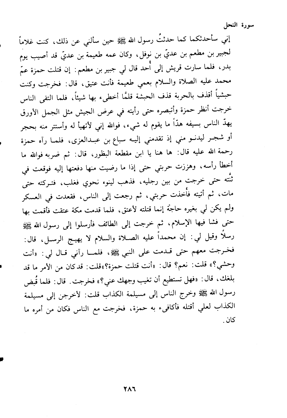 بْنُ مُطْعِمٍ: إِنْ قَتَلْتَ حَمْزَةَ عَمَّ مُحَمَّدٍ عَلَيْهِ الصَّلَاةُ وَالسَّلَامُ بِعَمِّي طُعَيْمَةَ فَأَنْتَ عَتِيقٌ، قَالَ: فَخَرَجْتُ وَكُنْتُ حَبَشِيًّا أَقْذِفُ بِالْحَرْبَةِ قَذْفَ الْحَبَشَةِ قَلَّمَا أُخْطِئُ بِهَا شَيْئًا، فَلَمَّا الْتَقَى النَّاسُ خَرَجْتُ أَنْظُرُ حَمْزَةَ وَأَتَبَصَّرُهُ حَتَّى رَأَيْتُهُ فِي عُرْضِ الْجَيْشِ مِثْلَ الْجَمَلِ الْأَوْرَقِ يَهُدُّ النَّاسَ بِسَيْفِهِ هَدًّا مَا يَقُومُ لَهُ شَيْءٌ، فَوَاللَّهِ إِنِّي لَأَتَهَيَّأُ لَهُ وَأَسْتَتِرُ مِنْهُ بِحَجَرٍ أَوْ شَجَرٍ لِيَدْنُوَ مِنِّي إِذْ تَقَدَّمَنِي إِلَيْهِ سِبَاعُ بْنُ عَبْدِ الْعُزَّى، فَلَمَّا رَآهُ حَمْزَةُ رَحْمَةُ اللَّهِ عليه قال: هاهنا يَا ابْنَ مُقَطِّعَةِ الْبُظُورِ، قَالَ: ثُمَّ ضَرَبَهُ فَوَاللَّهِ مَا أَخْطَأَ رَأْسَهُ، وَهَزَزْتُ حَرْبَتِي حَتَّى إِذَا مَا رَضِيتُ مِنْهَا دَفَعْتُهَا إِلَيْهِ فَوَقَعَتْ فِي ثُنَّتِهِ حَتَّى خَرَجَتْ مِنْ بَيْنِ رِجْلَيْهِ، فَذَهَبَ لِيَنُوءَ نَحْوِي فَغُلِبَ، فَتَرَكْتُهُ حَتَّى مَاتَ، ثُمَّ أَتَيْتُهُ فَأَخَذْتُ حَرْبَتِي، ثُمَّ رَجَعْتُ إِلَى النَّاسِ، فَقَعَدْتُ فِي الْعَسْكَرِ وَلَمْ يَكُنْ لِي بِغَيْرِهِ حَاجَةٌ إِنَّمَا قَتَلْتُهُ لِأُعْتَقَ، فَلَمَّا قدمت مكة عتقت فَأَقَمْتُ بِهَا حَتَّى فَشَا فِيهَا الْإِسْلَامُ، ثُمَّ خَرَجْتُ إِلَى الطَّائِفِ فَأَرْسَلُوا إِلَى رَسُولِ اللَّهِ - صَلَّى اللهُ عَلَيْهِ وَسَلَّمَ - رُسُلًا وَقِيلَ لِي: إِنَّ مُحَمَّدًا عَلَيْهِ الصَّلَاةُ وَالسَّلَامُ لَا يَهِيجُ الرُّسُلَ، قَالَ: فَخَرَجْتُ مَعَهُمْ حَتَّى قَدِمْتُ عَلَى النَّبِيِّ - صَلَّى اللهُ عَلَيْهِ وَسَلَّمَ - فَلَمَّا رَآنِي قَالَ لِي: "أَنْتَ وَحْشِيٌّ؟ " قُلْتُ: نَعَمْ؟ قَالَ: "أَنْتَ قَتَلْتَ حَمْزَةَ؟ " قُلْتُ: قَدْ كَانَ مِنَ الْأَمْرِ مَا قَدْ بَلَغَكَ، قَالَ: "فَهَلْ تَسْتَطِيعُ أَنْ تُغَيِّبَ وَجْهَكَ عَنِّي؟ " فَخَرَجْتُ. قَالَ: فَلَمَّا قُبِضَ رَسُولُ اللَّهِ - صَلَّى اللهُ عَلَيْهِ وَسَلَّمَ - وَخَرَجَ النَّاسُ إِلَى مُسَيْلِمَةَ الْكَذَّابِ قُلْتُ: لَأَخْرُجَنَّ إِلَى مُسَيْلِمَةَ الْكَذَّابِ لَعَلِّي أَقْتُلُهُ فَأُكَافِئَ بِهِ حَمْزَةَ، فَخَرَجْتُ مَعَ النَّاسِ فَكَانَ مِنْ أَمْرِهِ مَا كَانَ.