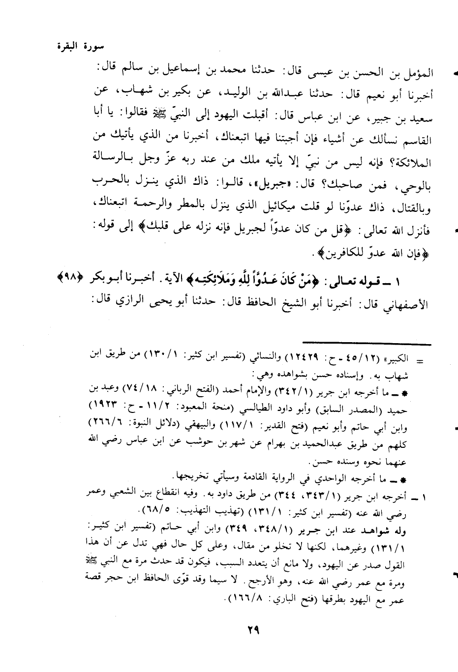 رَبِّهِ - عَزَّ وَجَلَّ - بِالرِّسَالَةِ بالوحيّ فَمَنْ صَاحِبُكَ؟ قَالَ: "جِبْرِيلُ" قَالُوا: ذَاكَ الَّذِي يَنْزِلُ بِالْحَرْبِ وَبِالْقِتَالِ، ذَاكَ عَدُوُّنَا لَوْ قُلْتَ مِيكَائِيلُ الذي ينزل بالمطر والرحمة اتبعناك، فَأَنْزَلَ اللَّهُ تَعَالَى: {قُلْ مَنْ كَانَ عَدُوًّا لِجِبْرِيلَ فَإِنَّهُ نَزَّلَهُ عَلَى قَلْبِكَ} إِلَى قَوْلِهِ: {فَإِنَّ اللَّهَ عَدُوٌّ لِلْكَافِرِينَ}