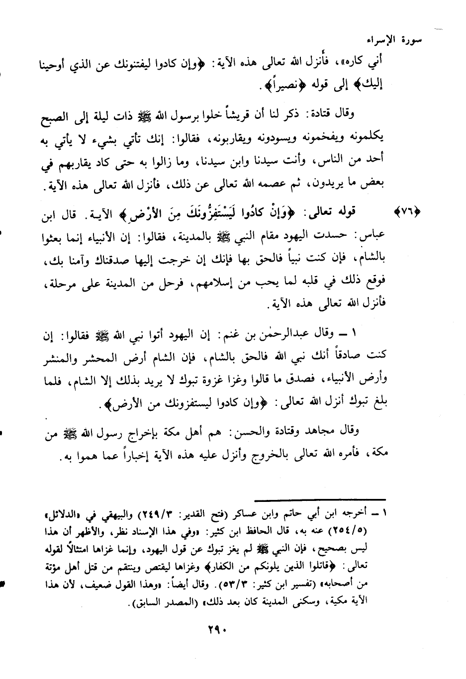 (¬1) - أخرجه ابن أبي حاتم وابن عساكر (فتح القدير: 3/249) والبيهقي في "الدلائل" (5/254) عنه به، قال الحافظ ابن كثير: "وفي هذا الإسناد نظر، والأظهر أن هذا ليس بصحيح، فإن النبي صَلَّى اللهُ عَلَيْهِ وَسَلَّمَ لم يغز تبوك عن قول اليهود، وإنما غزاها امتثالا لقوله تعالى: (قاتلوا الذين يلونكم من الكفار) وغزاها ليقتص وينتقم من قتل أهل مؤتة من أصحابه" (تفسير ابن كثير: 3/53) وقال أيضا: "وهذا القول ضعيف؛ لأن هذا الآية مكية، وسكنى المدينة كان بعد ذلك" (المصدر السابق) .