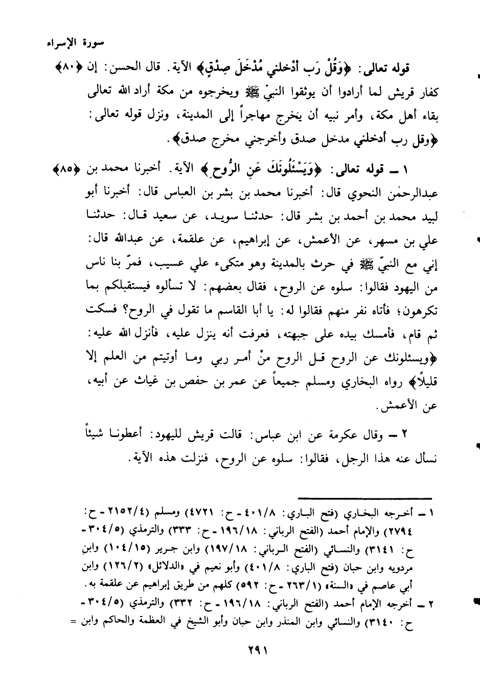 أَخْبَرَنَا مُحَمَّدُ بْنُ عَبْدِ الرَّحْمَنِ النَّحْوِيُّ قَالَ: أَخْبَرَنَا مُحَمَّدُ بْنُ بِشْرِ بْنِ الْعَبَّاسِ قَالَ: أَخْبَرَنَا أَبُو لَبِيدٍ مُحَمَّدُ بْنُ أَحْمَدَ بْنِ بِشْرٍ قَالَ: حَدَّثَنَا سُوَيْدٌ، عَنْ سَعِيدٍ قَالَ: حَدَّثَنَا عَلِيُّ بْنُ مُسْهِرٍ، عَنِ الْأَعْمَشِ، عَنْ إِبْرَاهِيمَ، عَنْ عَلْقَمَةَ، عَنْ عَبْدِ اللَّهِ قَالَ: إِنِّي مَعَ النَّبِيِّ - صَلَّى اللهُ عَلَيْهِ وَسَلَّمَ - فِي حَرْثٍ بِالْمَدِينَةِ وَهُوَ مُتَّكِئٌ عَلَى عَسِيبٍ، فَمَرَّ بِنَا نَاسٌ مِنَ الْيَهُودِ فَقَالُوا: سَلُوهُ عَنِ الرُّوحِ، فَقَالَ بَعْضُهُمْ: لَا تَسْأَلُوهُ فَيَسْتَقْبِلَكُمْ بِمَا تَكْرَهُونَ؛ فَأَتَاهُ نَفَرٌ مِنْهُمْ فَقَالُوا لَهُ: يَا أَبَا الْقَاسِمِ مَا تَقُولُ فِي الرُّوحِ؟ فَسَكَتَ ثُمَّ قَامَ، فَأَمْسَكَ بِيَدِهِ عَلَى جَبْهَتِهِ، فَعَرَفْتُ أَنَّهُ يُنَزَّلُ عَلَيْهِ، فَأَنْزَلَ اللَّهُ عَلَيْهِ: {وَيَسْأَلُونَكَ عَنِ الرُّوحِ قُلِ الرُّوحُ مِنْ أَمْرِ رَبِّي وَمَا أُوتِيتُمْ مِنَ الْعِلْمِ إِلَّا قَلِيلًا} رَوَاهُ الْبُخَارِيُّ وَمُسْلِمٌ جَمِيعًا عَنْ عُمَرَ بْنِ حَفْصِ بْنِ غِيَاثٍ عَنْ أَبِيهِ، عَنِ الْأَعْمَشِ.
