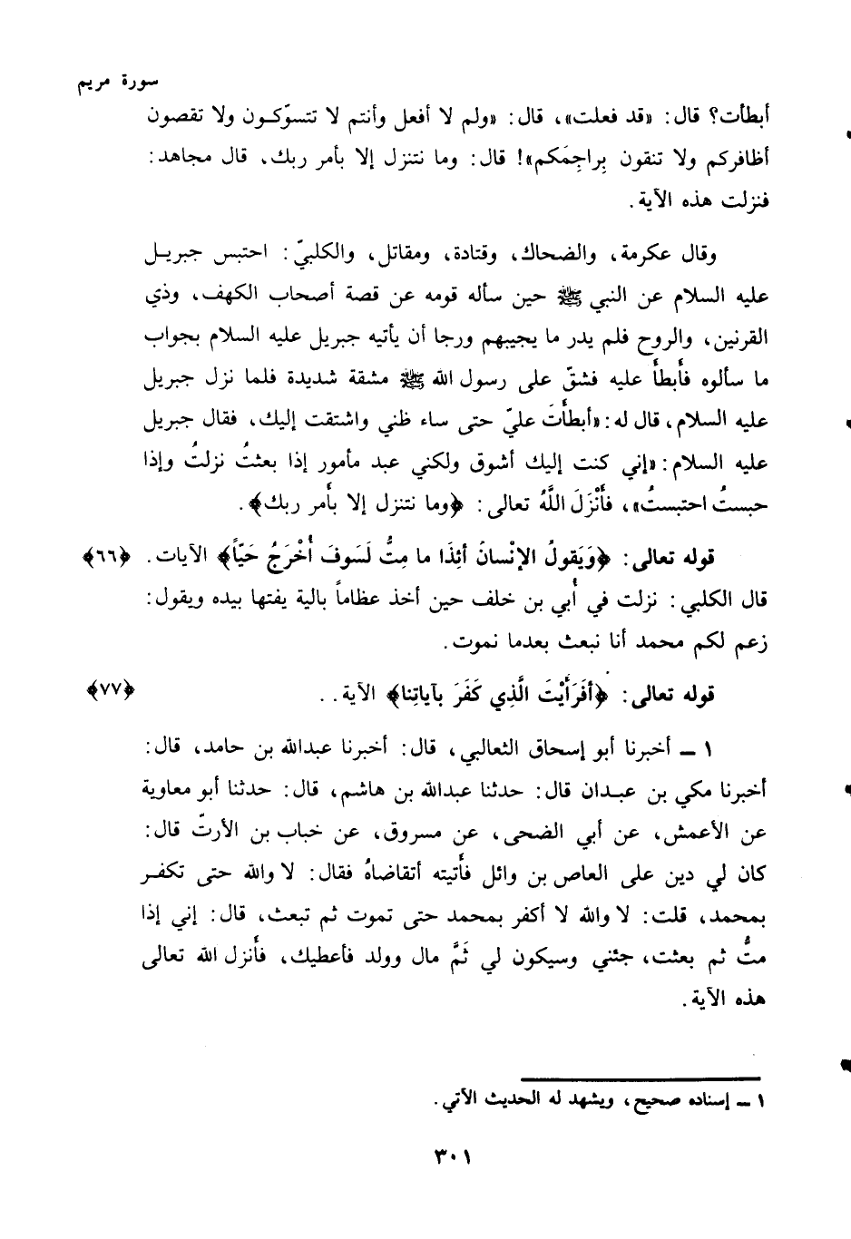 (¬1) - أَخْبَرَنَا أَبُو إِسْحَاقَ الثَّعَالِبِيُّ، قَالَ: أَخْبَرَنَا عَبْدُ اللَّهِ بْنُ حَامِدٍ، قَالَ: أَخْبَرَنَا مَكِّيُّ بْنُ عَبْدَانَ قَالَ: حَدَّثَنَا عَبْدُ اللَّهِ بْنُ هَاشِمٍ، قَالَ: حَدَّثَنَا أَبُو مُعَاوِيَةَ عَنِ الْأَعْمَشِ، عَنْ أَبِي الضُّحَى، عَنْ مَسْرُوقٍ، عَنْ خَبَّابِ بْنِ الْأَرَتِّ قَالَ: كَانَ لِي دَيْنٌ عَلَى الْعَاصِ بْنِ وَائِلٍ فَأَتَيْتُهُ أَتَقَاضَاهُ فَقَالَ: لَا وَاللَّهِ حَتَّى تَكْفُرَ بِمُحَمَّدٍ، قُلْتُ: لَا وَاللَّهِ لَا أَكْفُرُ بِمُحَمَّدٍ حَتَّى تَمُوتَ ثُمَّ تُبْعَثَ، قَالَ: إِنِّي إِذَا مِتُّ ثم بعثت، جئني وَسَيَكُونُ لِي ثَمَّ مَالٌ وَوَلَدٌ فَأُعْطِيكَ، فَأَنْزَلَ اللَّهُ تَعَالَى هَذِهِ الْآيَةَ.